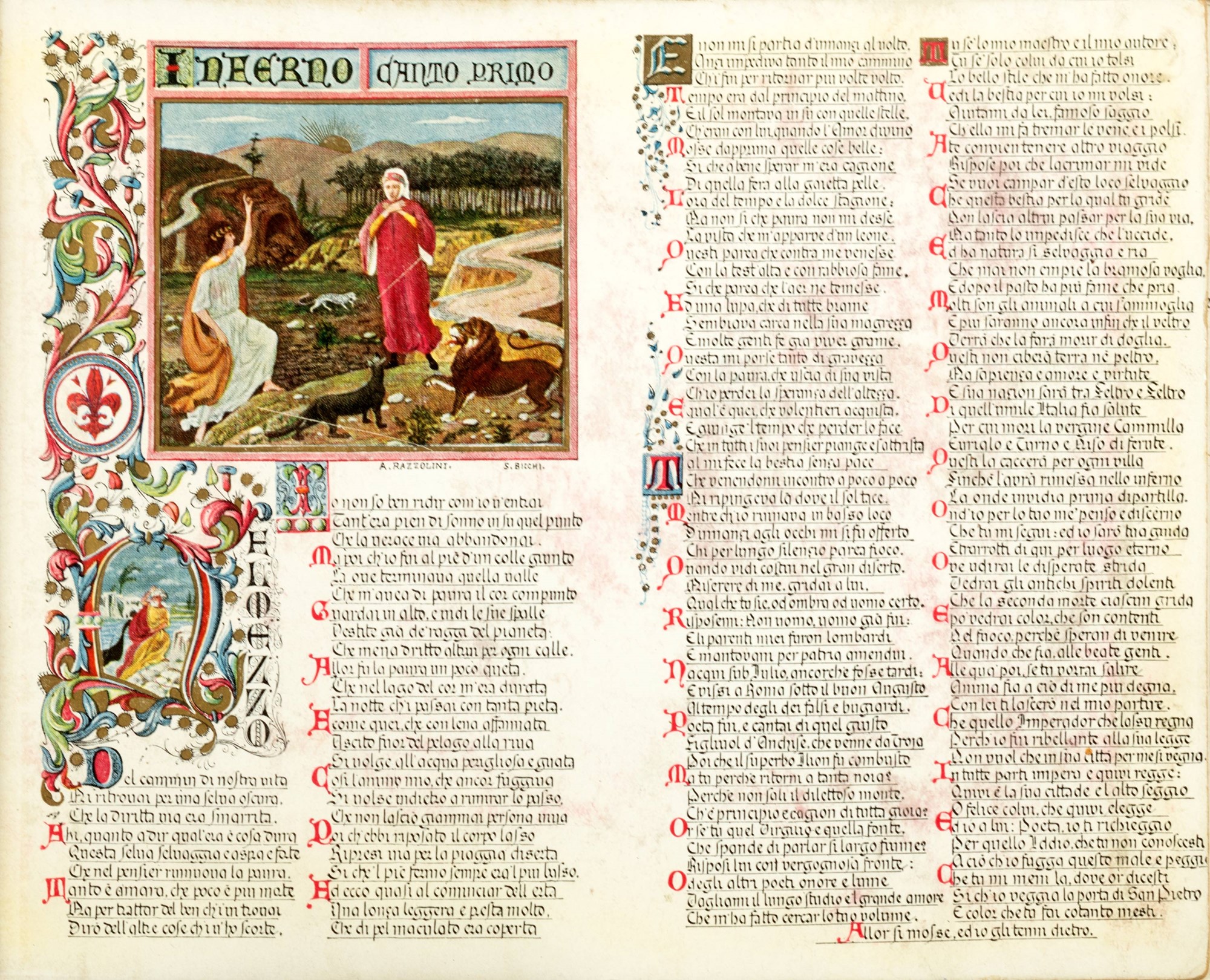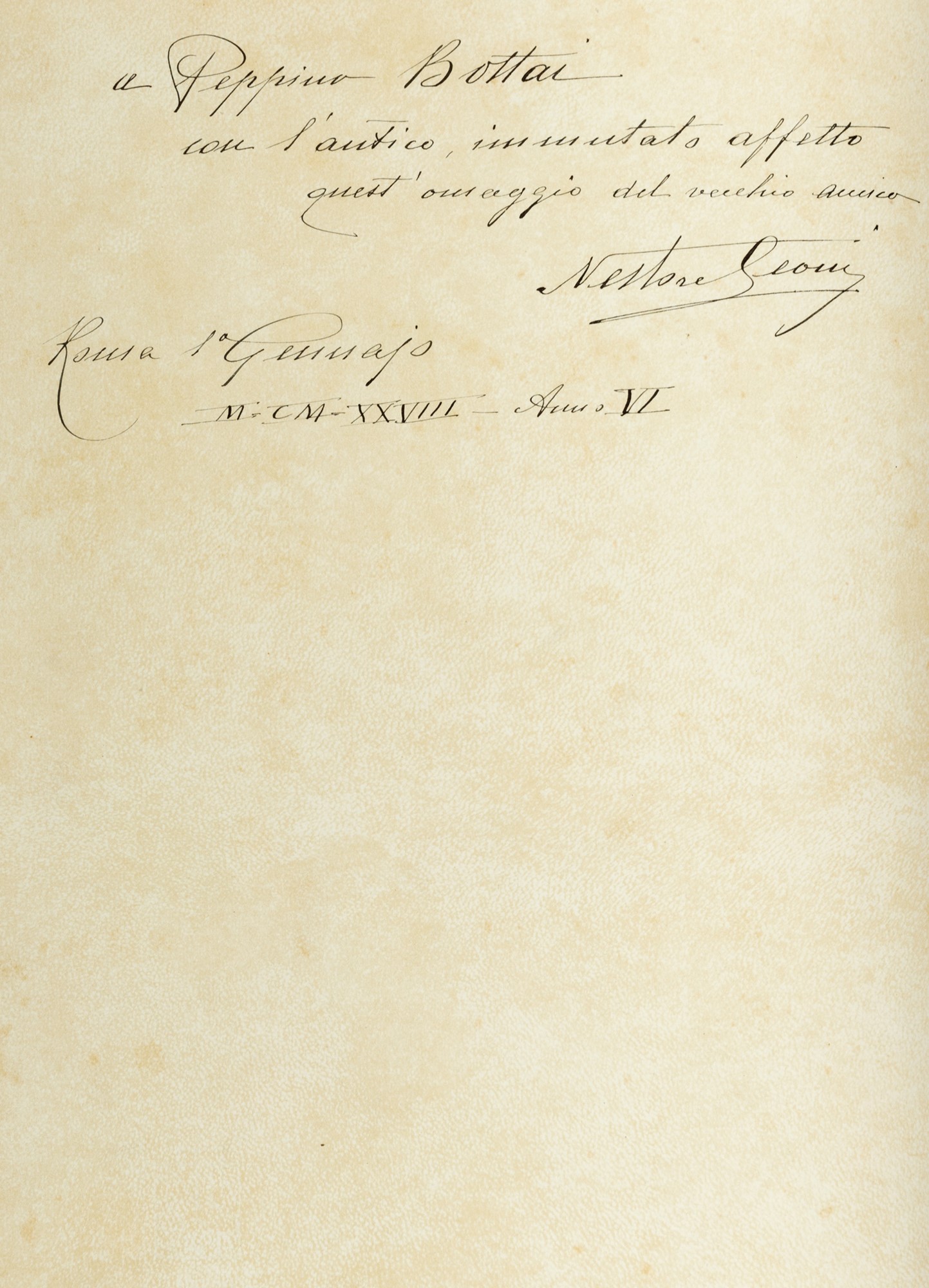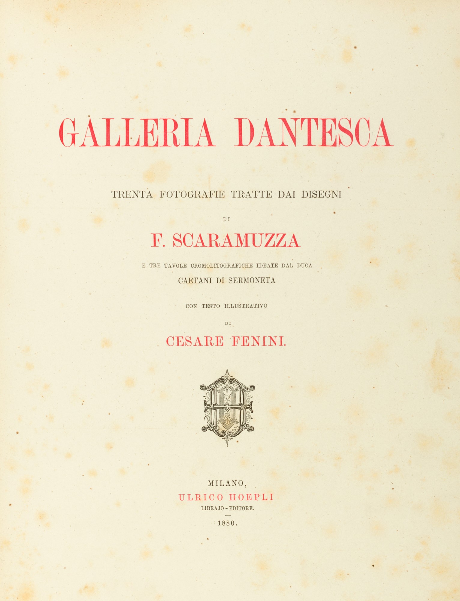 Bergamo, Statuto Italiano di Arti Grafiche, 1921. In 4°. Con numerose illustrazioni a colori e fregi in oro e a colori, fogli doppi chiusi, legatura editoriale in velluto con decorazioni ricamate in oro ai piatti, taglio superiore dorato, abrasioni al dorso. Dedica di Nestore Leoni a Giuseppe Bottai datata Roma 1 gennaio 1938, Anno VI. § Alighieri, Dante; Razzolini, Attilio. La Divina Commedia illustrata dall'Ing. Attilio Razzolini Milano, Alfieri & Lacroix, 1902. In 24° oblungo. Con 104 pagine litografiche a colori, con illustrazioni ad inizio di ciascuna cantica, iniziali figurate e vignette, caratteri gotici del sec. XV, leggero ingiallimento marginale, legatura editoriale in mezzatela, ritratto di Dante entro inserto ovale in pelle al piatto anteriore, tracce di lacci di chiusura in pelle ai piatti, leggeri difetti. § Fenini, Cesare; Scaramuzza, Francesco, Galleria Dantesca, Milano, Hoepli, 1880. Con 3 cromolitografie e 30 tavole, fioriture, leggera brunitura, qualche arrossatura, strappo al margine bianco con mancanza alla carta contenente il Canto I, senza perdita di testo, difetti alle cerniere interne, legatura in tessuto, piatto anteriore decorato in nero e oro con al centro ritratto di dante, tagli dorati, difetti a cerniere e dorso, qualche piccola macchia.
