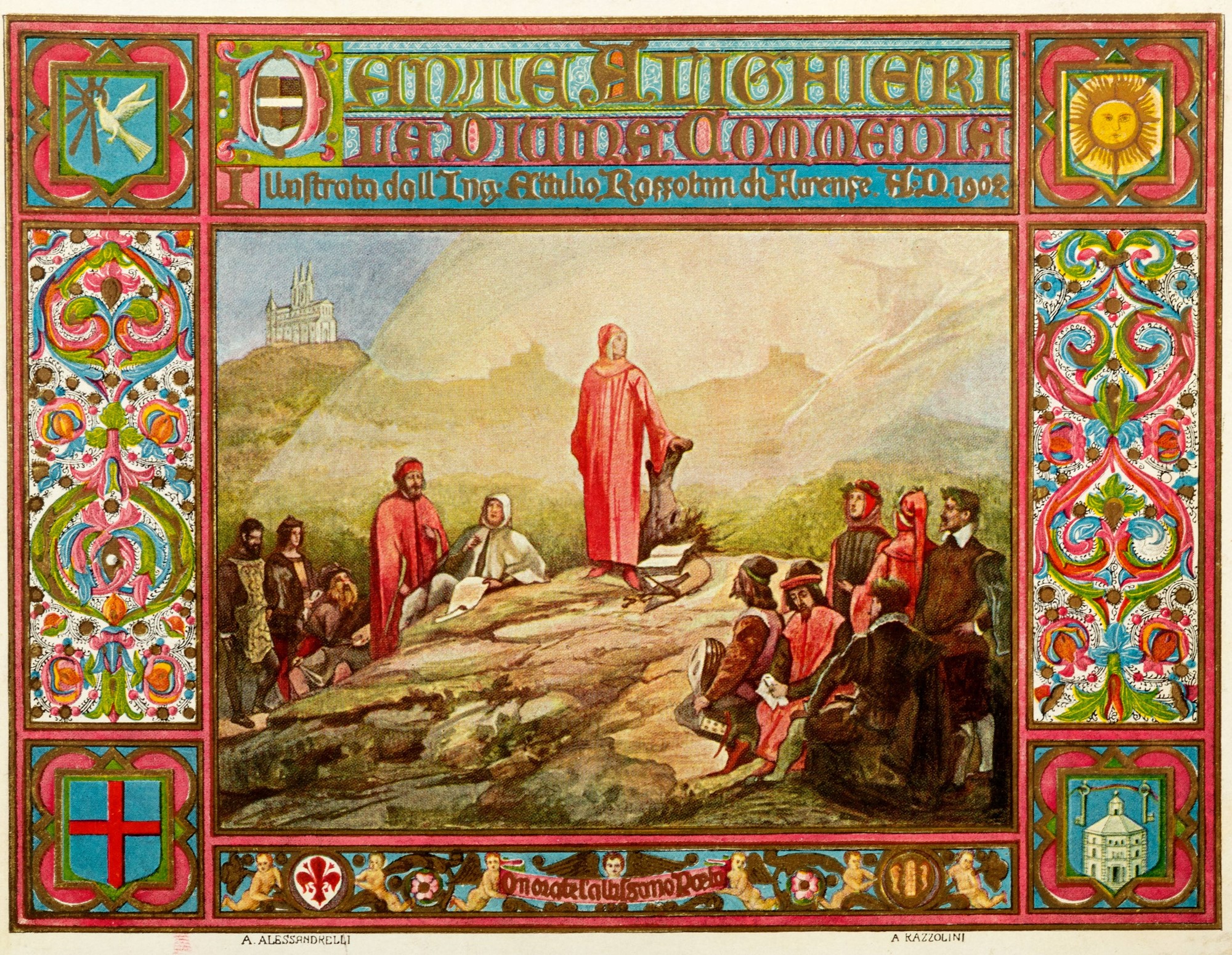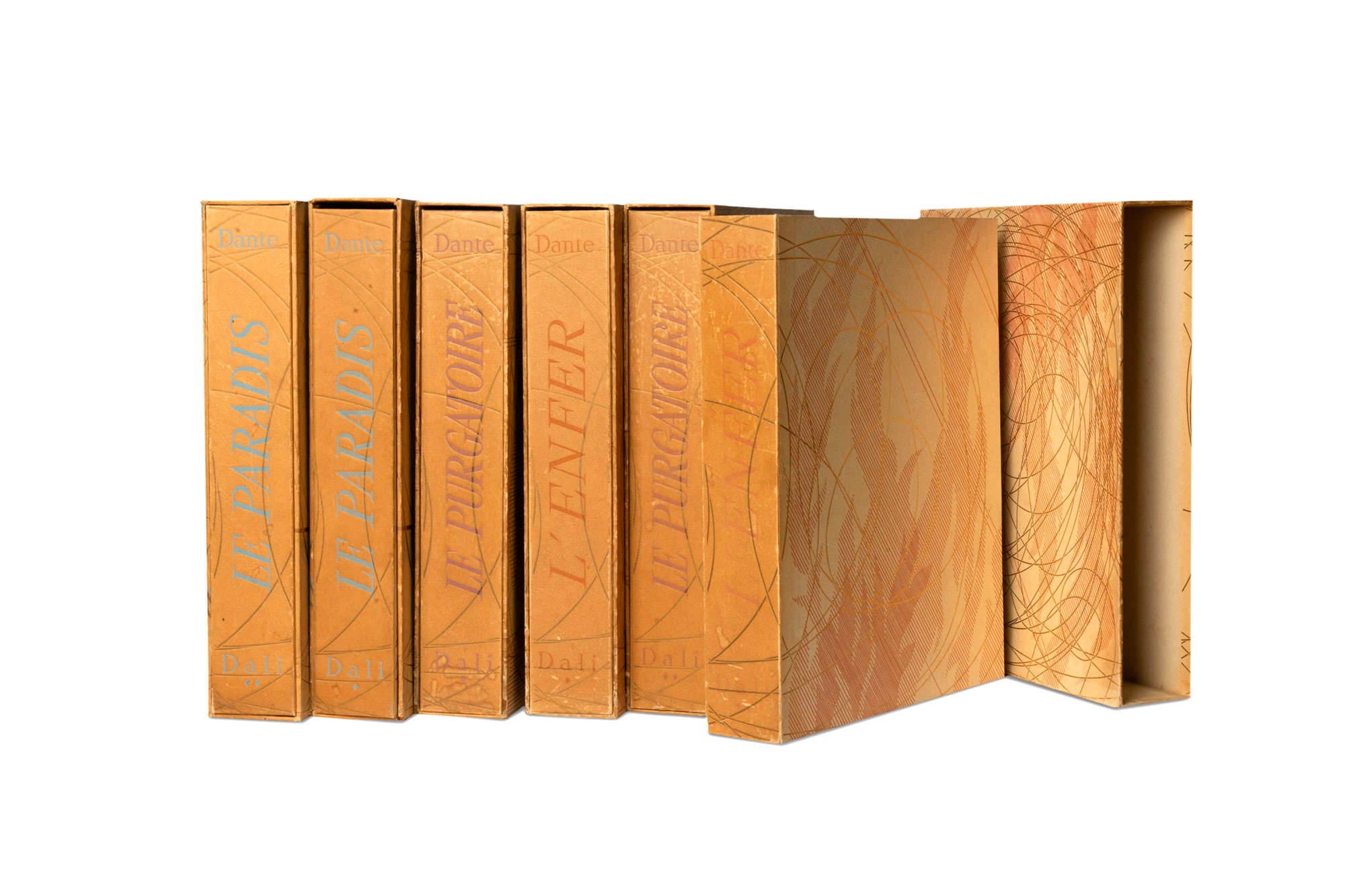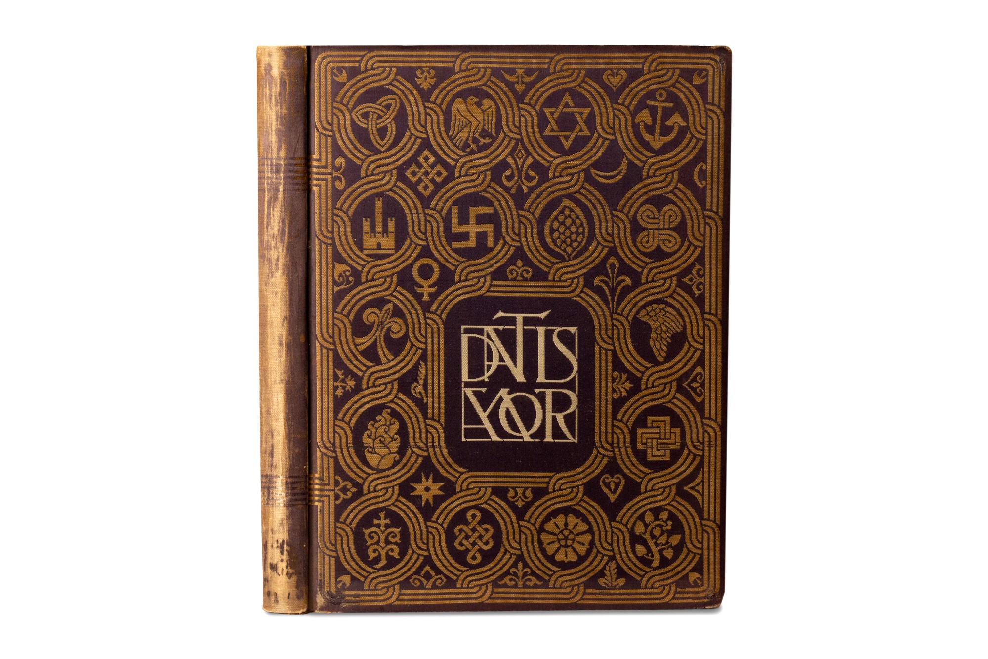Bergamo, Statuto Italiano di Arti Grafiche, 1921. In 4°. Con numerose illustrazioni a colori e fregi in oro e a colori, fogli doppi chiusi, legatura editoriale in velluto con decorazioni ricamate in oro ai piatti, taglio superiore dorato, abrasioni al dorso. Dedica di Nestore Leoni a Giuseppe Bottai datata Roma 1 gennaio 1938, Anno VI. § Alighieri, Dante; Razzolini, Attilio. La Divina Commedia illustrata dall'Ing. Attilio Razzolini Milano, Alfieri & Lacroix, 1902. In 24° oblungo. Con 104 pagine litografiche a colori, con illustrazioni ad inizio di ciascuna cantica, iniziali figurate e vignette, caratteri gotici del sec. XV, leggero ingiallimento marginale, legatura editoriale in mezzatela, ritratto di Dante entro inserto ovale in pelle al piatto anteriore, tracce di lacci di chiusura in pelle ai piatti, leggeri difetti. § Fenini, Cesare; Scaramuzza, Francesco, Galleria Dantesca, Milano, Hoepli, 1880. Con 3 cromolitografie e 30 tavole, fioriture, leggera brunitura, qualche arrossatura, strappo al margine bianco con mancanza alla carta contenente il Canto I, senza perdita di testo, difetti alle cerniere interne, legatura in tessuto, piatto anteriore decorato in nero e oro con al centro ritratto di dante, tagli dorati, difetti a cerniere e dorso, qualche piccola macchia.