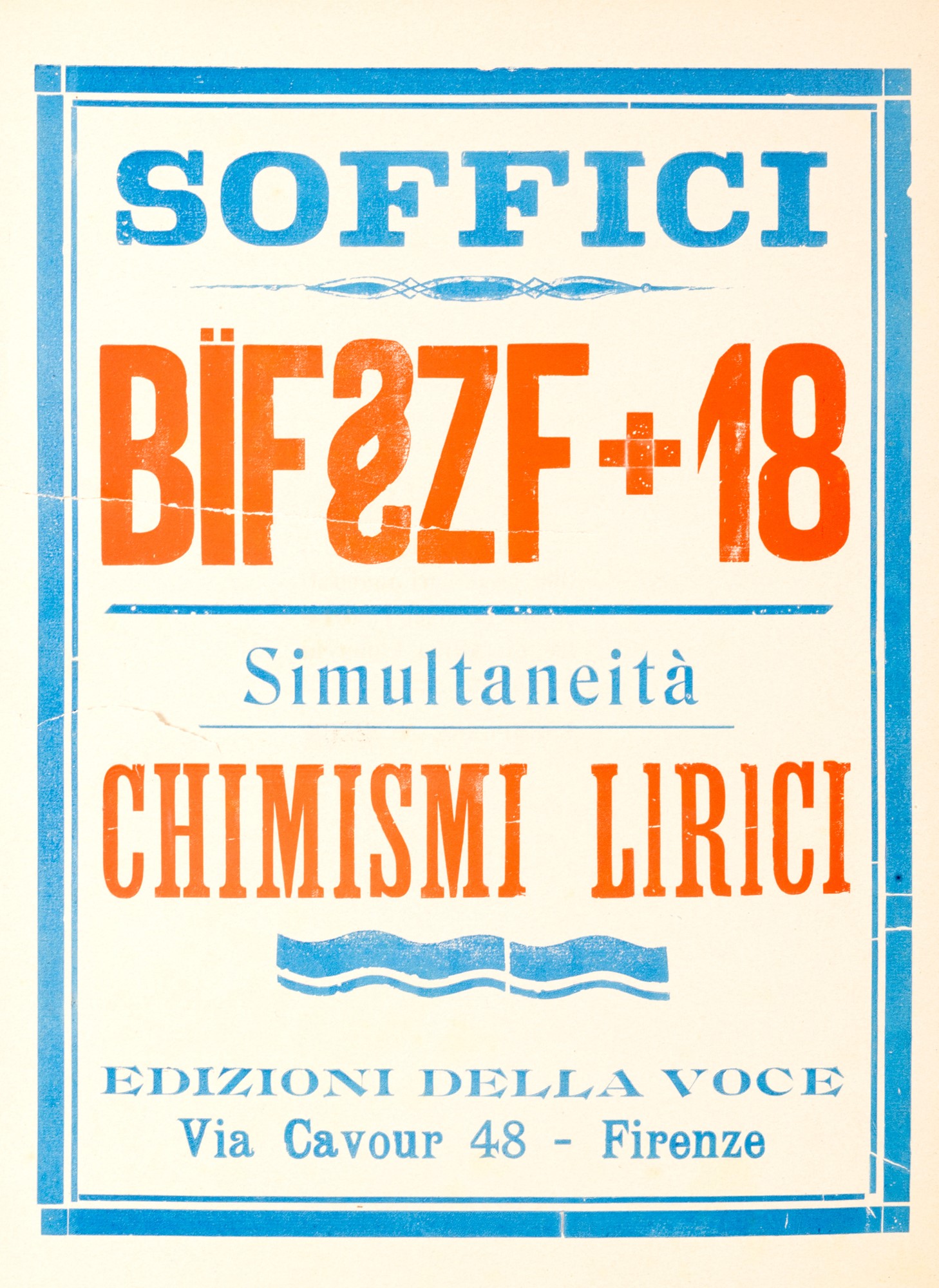 Prima edizione, con fascicoli intonsi, di uno dei più celebri libri d'artista futuristi, il libro-giornale era stato pensato per essere letto, sfogliato e gettato via. L'enigmatico titolo di questo libro va letto "Bizzeffe più diciotto". La tiratura di 300 esemplari andò in gran parte distrutta con l'alluvione del 1966, giacendo ancora invenduta presso i magazzini Vallecchi. Il nostro esemplare è il n. 226.