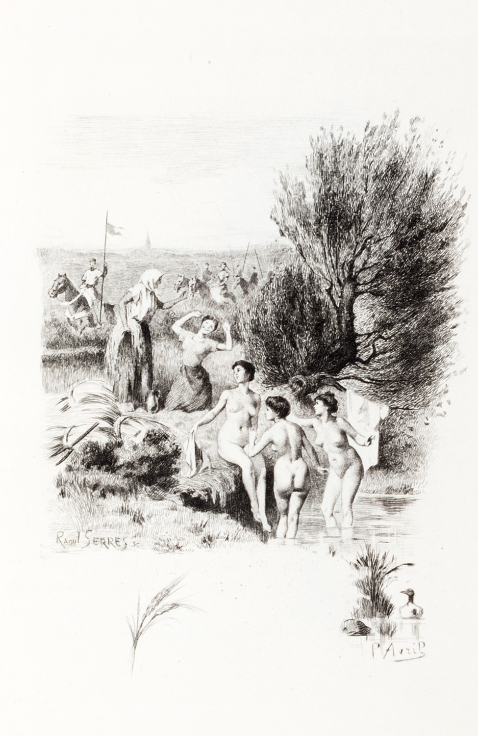 Parigi, Charles Bosse, 1901. In 8° grande. Ritratto dell’autore in antiporta, illustrazione al frontespizio in rosso e nero 32 illustrazioni nel testo di Paul Avril incise all'acquaforte ciascuna protetta da velina, conservata la brossura editoriale stampata in elegante legatura dell'epoca in marocchino rosso, con al centro dei piatti una placca stilizzata impressa in oro, al dorso decorato in oro, autore e titolo, custodia in cartonato marmorizzato.