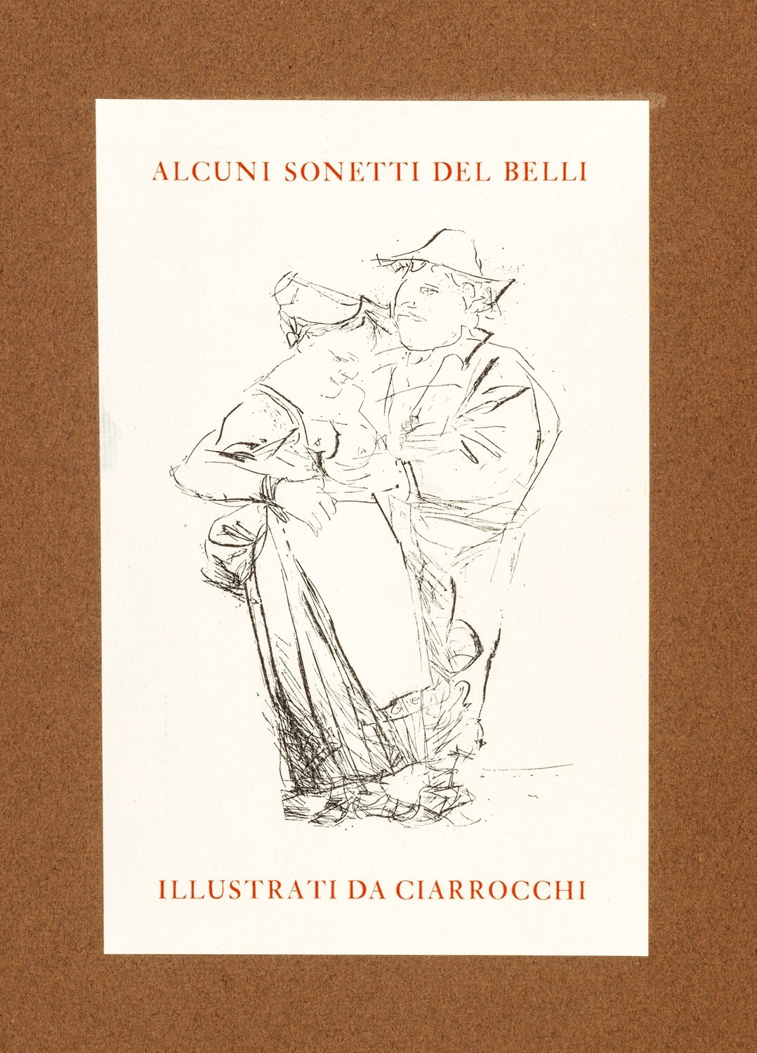 Verona, Franco Riva, 1962. In 2°. Con 1 acquaforte firmata e numerata di Vespignani, brossura in cartoncino rossa entro cartellina e custodia in tela grigia, autori impressi in nero al dorso, leggera spellatura al piatto, lievi difetti. § Insieme nel lotto Belli, Gioacchino; Ciarrocchi, Arnoldo, Alcuni sonetti del Belli, Verona, Franco Riva, 1968. In 2°. Con 3 acqueforti firmate e numerate di Ciarrocchi, brossura in cartoncino con piatto illustrato entro cartellina e custodia marrone, difetti ai tagli della custodia.