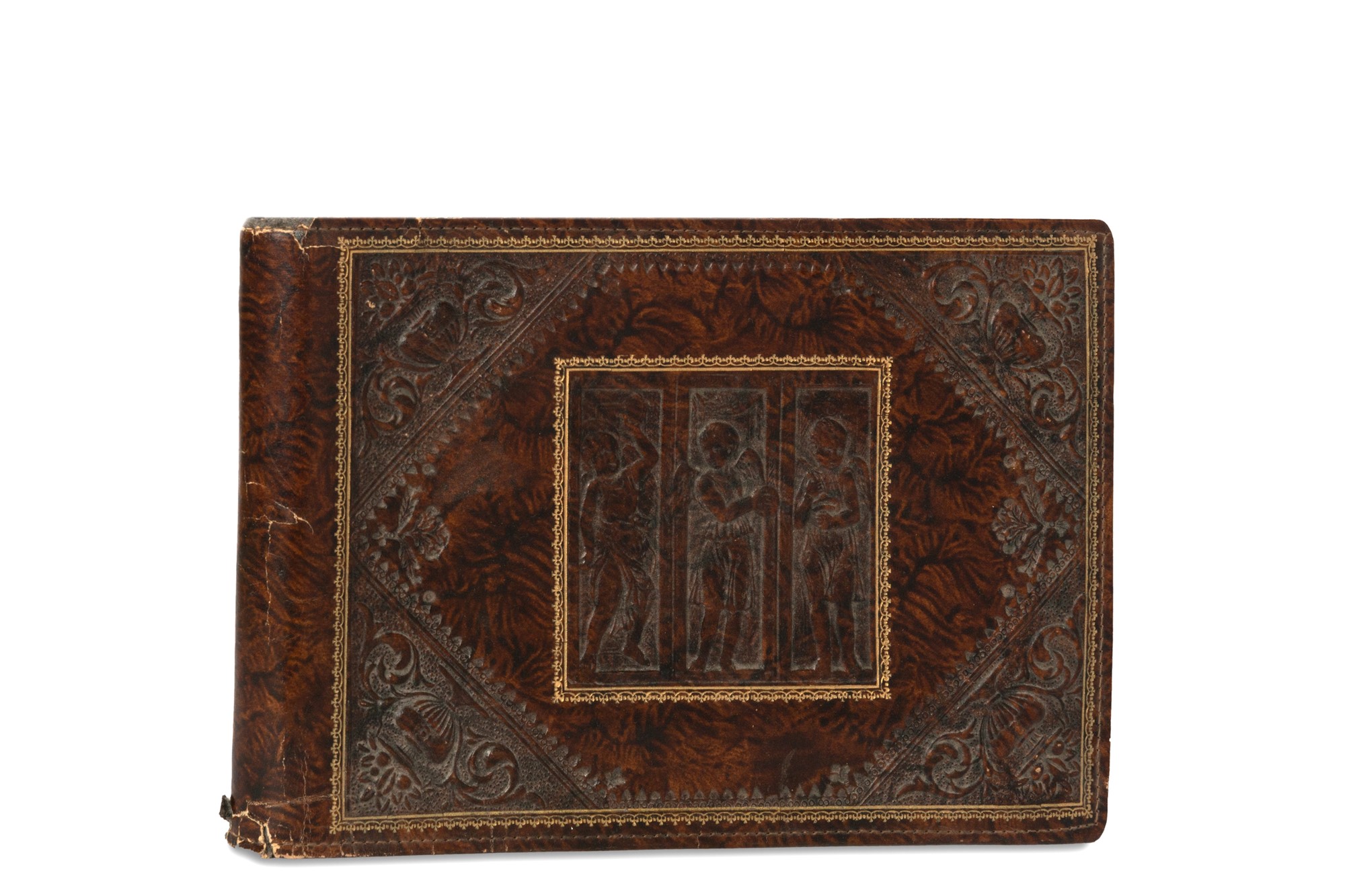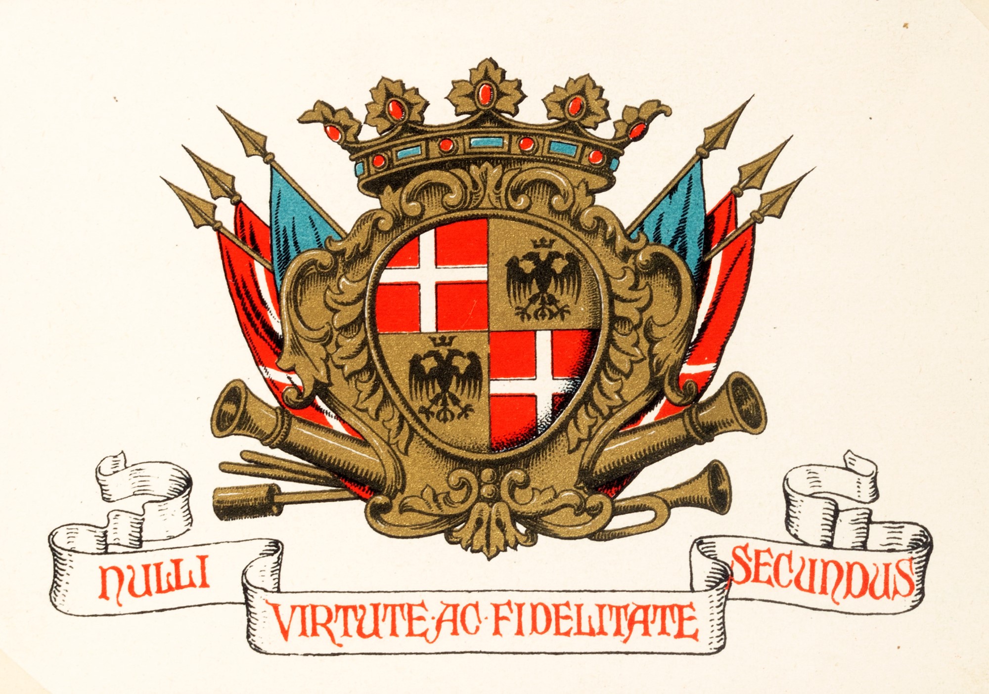Album oblungo contenente 25 cartoline a colori di cui: 9 cartoline del 2° Reggimento Fanteria "Re" (Cravatte Rosse di Savoia - 1664), dalla serie "Le Bandiere",n. 2-10; 6 cartoline della "Brigata Acqui"; 10 cartoline che raffigurano decorazioni e distintivi italiani, qualche piccola macchia, lievi fioriture, legatura coeva in pelle, piatti entro doppia cornice impressa in oro e belle decorazioni a secco, lievi difetti al dorso.
