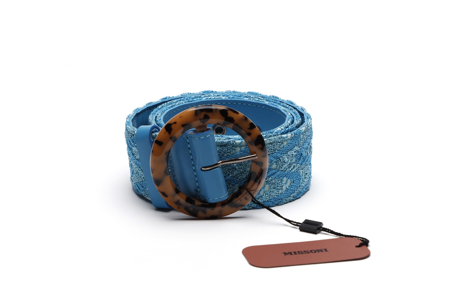 MISSONI Cintura in stoffa nelle sfumature dell' azzurro. Interno in pelleTaglia 75. Logo all'interno. Tessuto e pelle. .