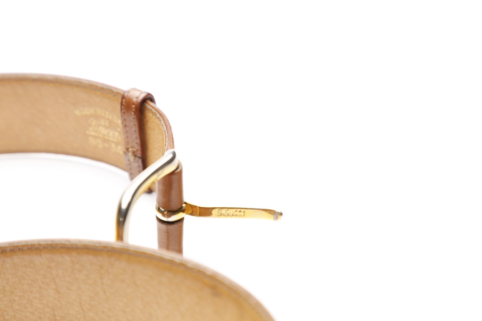 GUCCI Cintura in pelle color cuoio con fibbia oro. Fine anni 80. Metallo e pelle. Cm 95,00. Marchio Made in Italy by Gucci. Misura: 85. Lievi difetti e segni di usura.