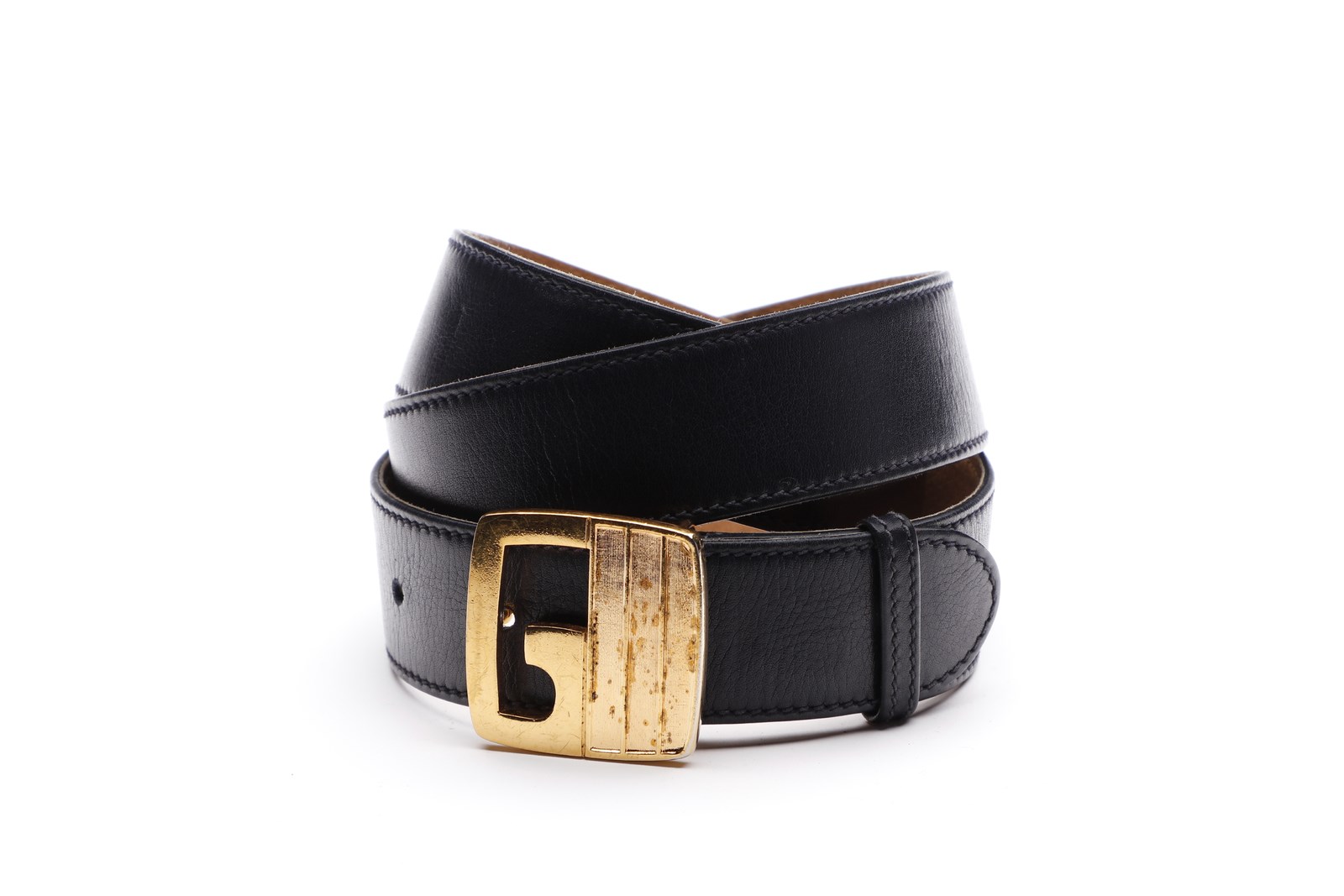 GUCCI Cintura in pelle blu con galvanica in metallo dorato. 1980. Metallo e pelle. Cm 90,00 x 3,00. Marchio Gucci - Made in Italy.