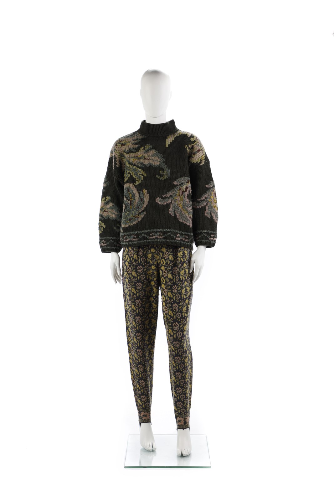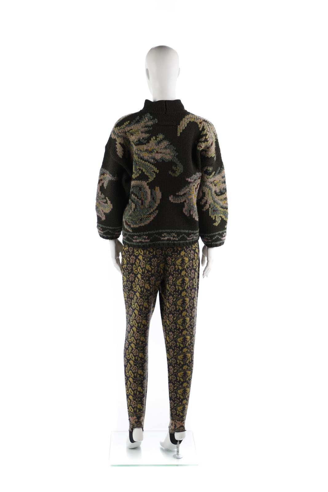 GAULTIER JEAN-PAUL Completo in lana, maglia e fuseaux con staffa, colore verde oliva, rosa e giallo. Difetto presente. Inizio anni 80. Lana.. .