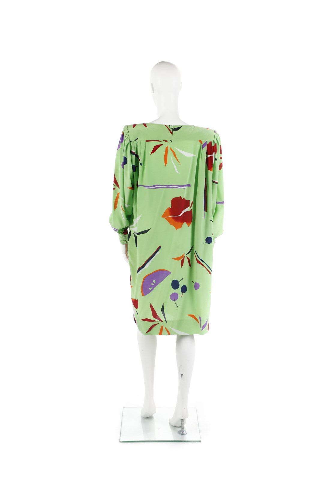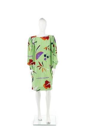 UNGARO EMANUEL - Linea Solo Donna. Abito in seta con fantasia geometrica su fondo verde acido, spalline imbottite.Inizi anni 90. Taglia 46IT.