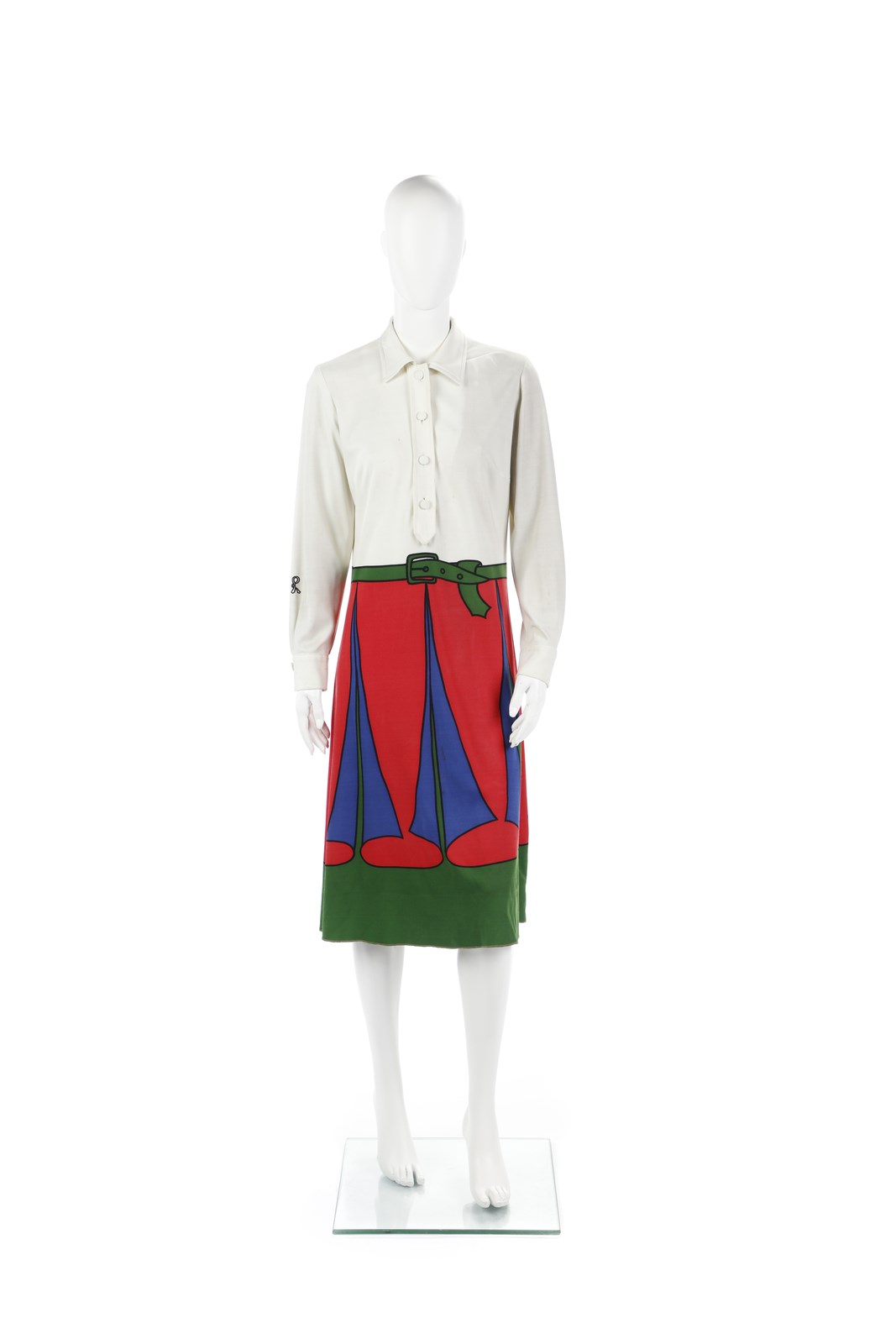 DI CAMERINO ROBERTA (1920 - 2010) Abito longuette con chiusura a bottoni e colletto. Bianco con gonna trompe l'oeil nei caratteristici toni del blu, del verde e del rosso. Anni '70. lana. . Segni di usura,