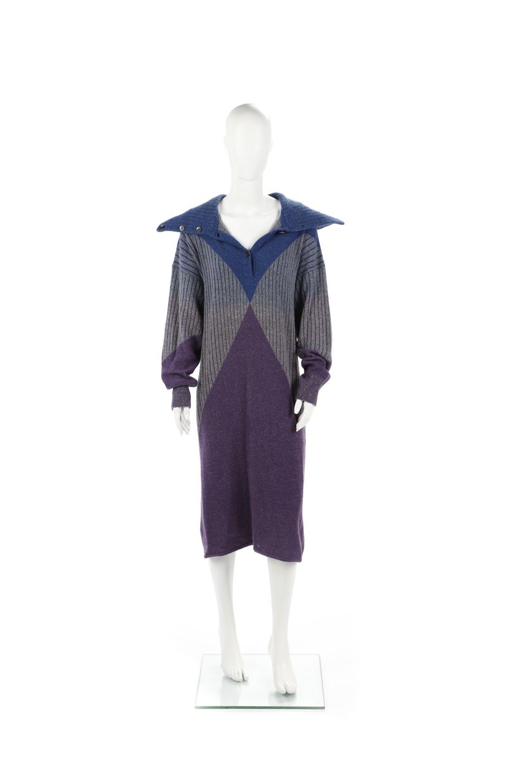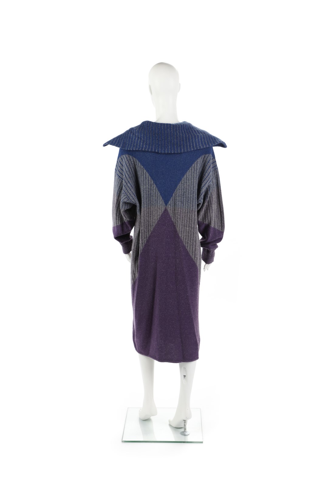 BIAGIOTTI LAURA Abito lungo nei toni del blu, del grigio e del viola, ampio collo con bottoni e ampie maniche a sbuffo.Taglia 44. anni 80. lana. . Difetti.