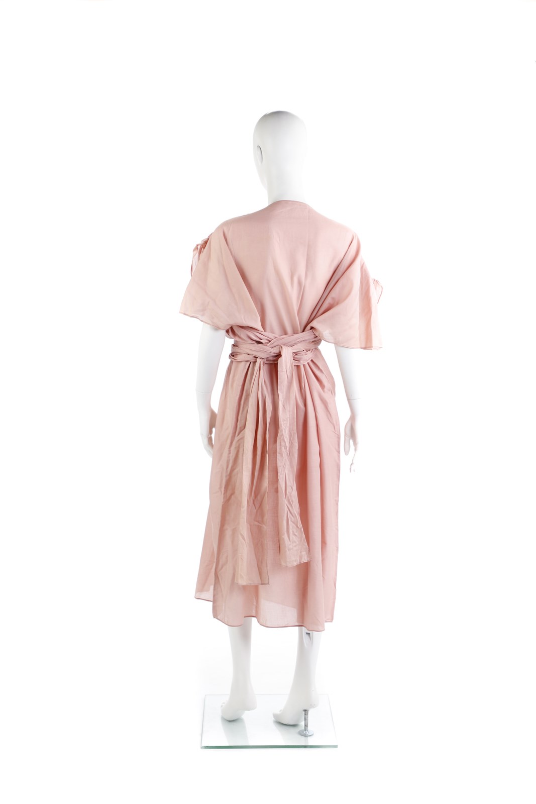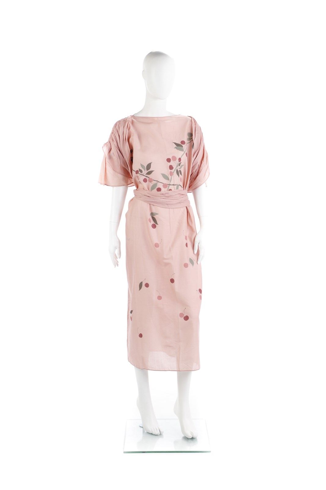 RUGGERI CINZIA Tunica cipria con stampa rami di ciliegio. Dalla spalla pende una lunga fusciacca annodabile in vita. Certificato di Provenienza Franco Jacassi. Made in Italy. Anni 80. Cotone. .