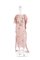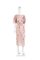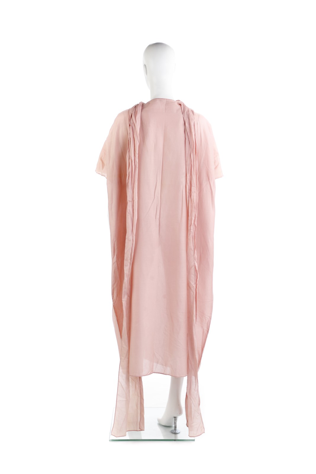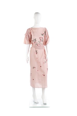 RUGGERI CINZIA - Tunica cipria con stampa rami di ciliegio. Dalla spalla pende una lunga fusciacca annodabile in vita. Certificato di Provenienza Franco Jacassi. Made in Italy. Anni 80.