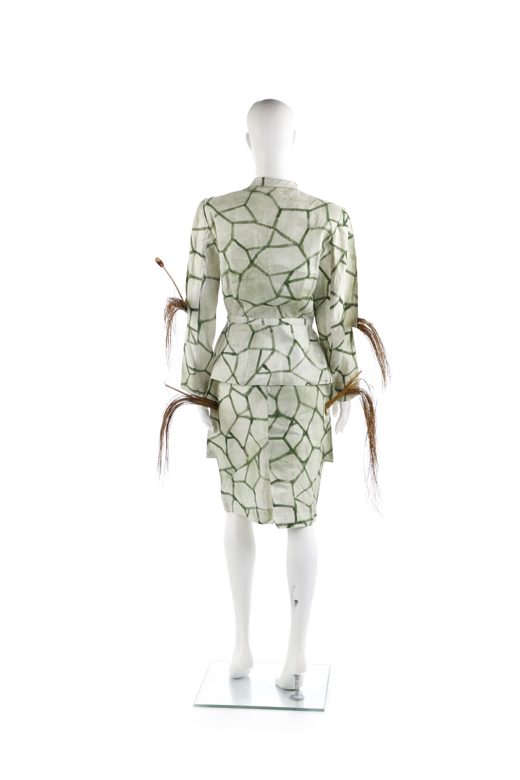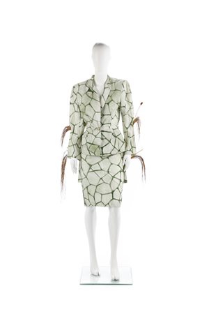 RUGGERI CINZIA - Giacca e gonna dipinta prato con applicazione ed inserti ultilizzati per la sfilata degli abiti e poi rimossi. Certificato di provenienza Franco Jacassi.