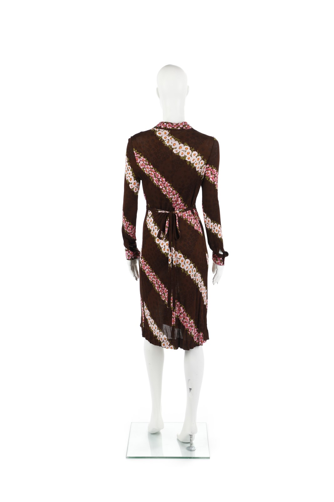 MATTIOLI DEI Abito con stampa floreale su fondo marrone con scollatura e cintura. Seta. Cm 140,00 x 44,00.