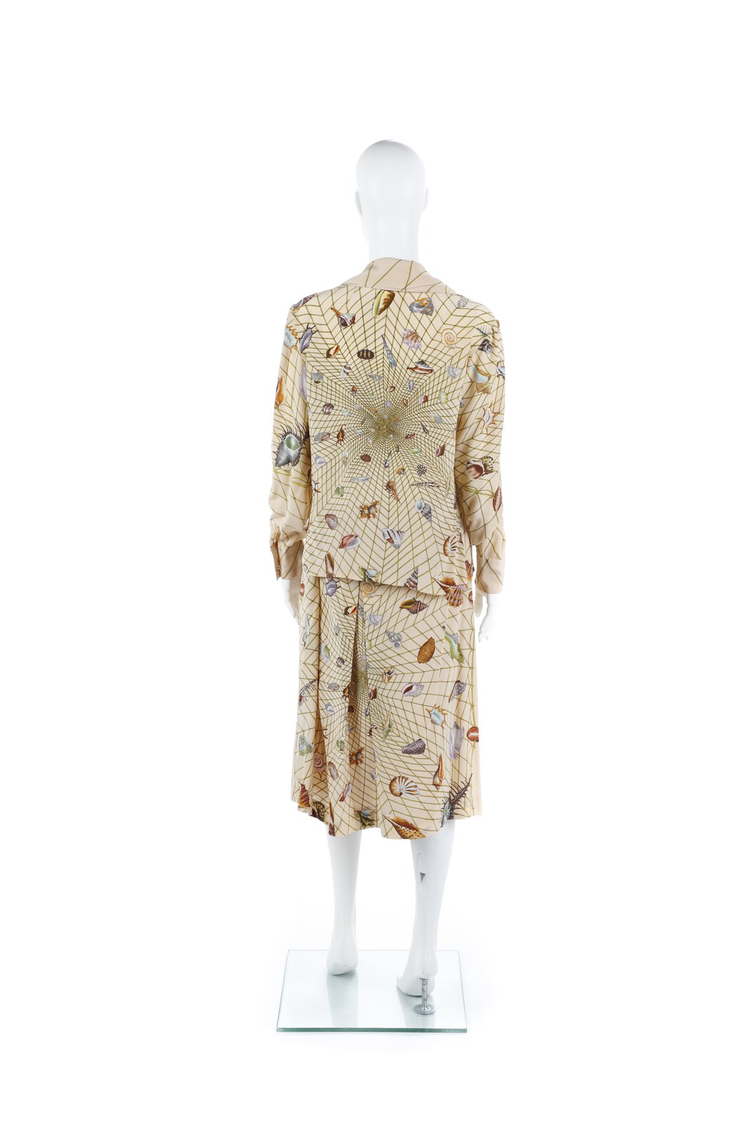 GUCCI - Completo donna composto da camicia e gonna con fantasia a conchiglie su fondo panna. Anni 70.