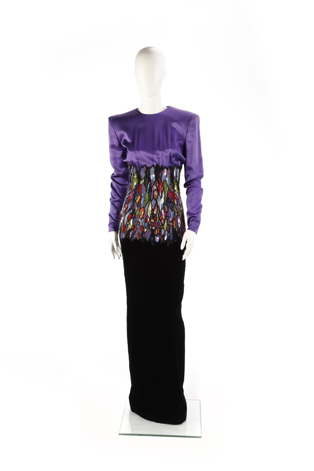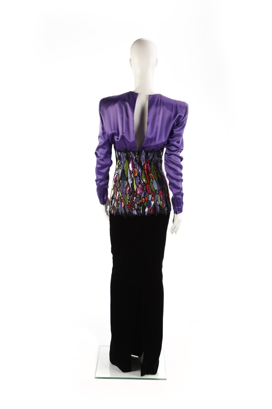 SCHON MILA - Abito alta moda anni 80 con manica lunga in raso viola, velluto e ricamo ramage multicolore.Certificato di provenienza Franco Jacassi.