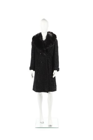 AUTORE NON IDENTIFICATO Pelliccia in astrakan nero e collo in volpe. Pelle e pelliccia. Cm 44,00 x 100,00. Etichetta, pellicceria Tellini La Spezia.