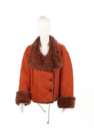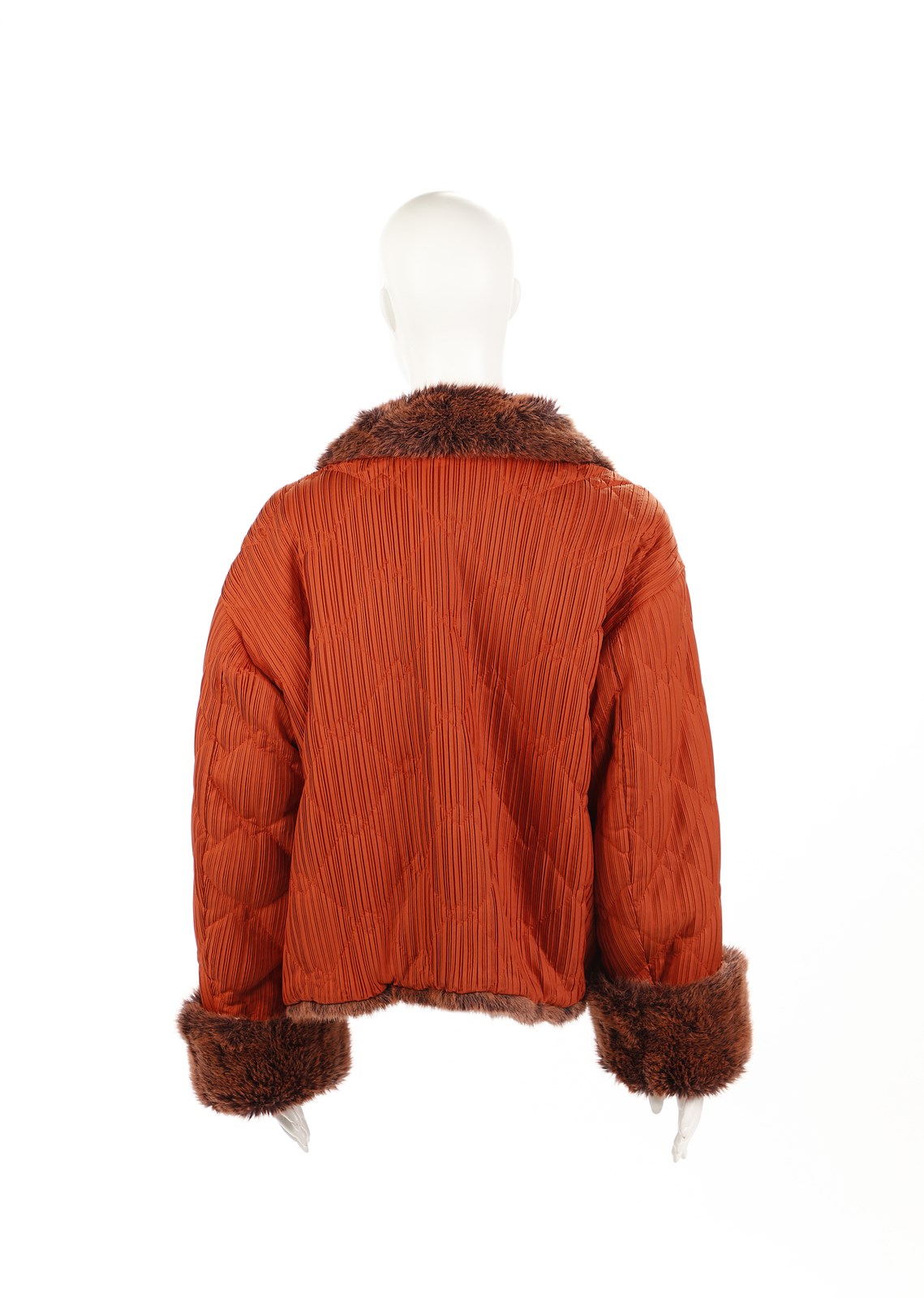 MIYAKE ISSEY - Giaccone arancione plissettato con interno in eco pelliccia marrone.
