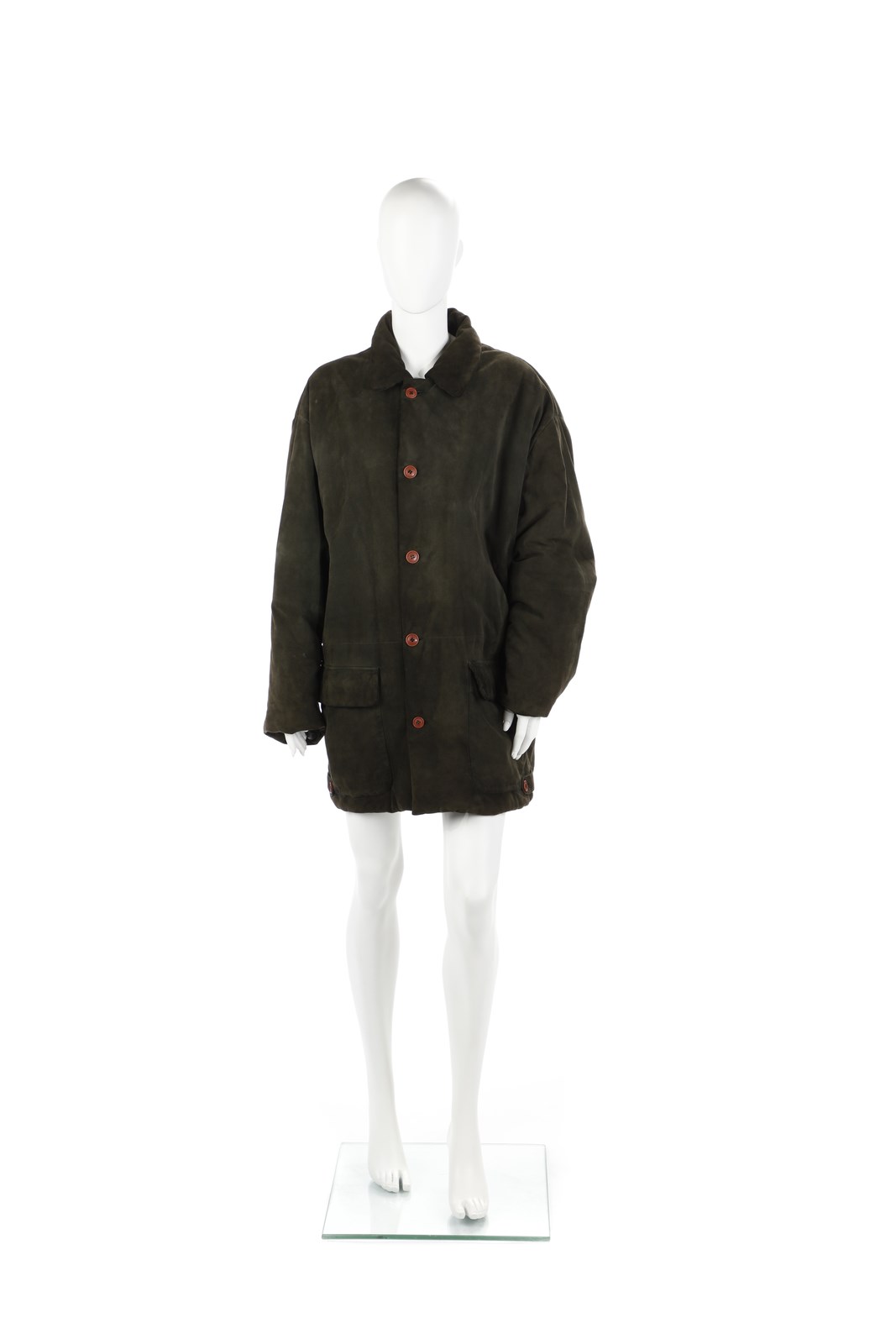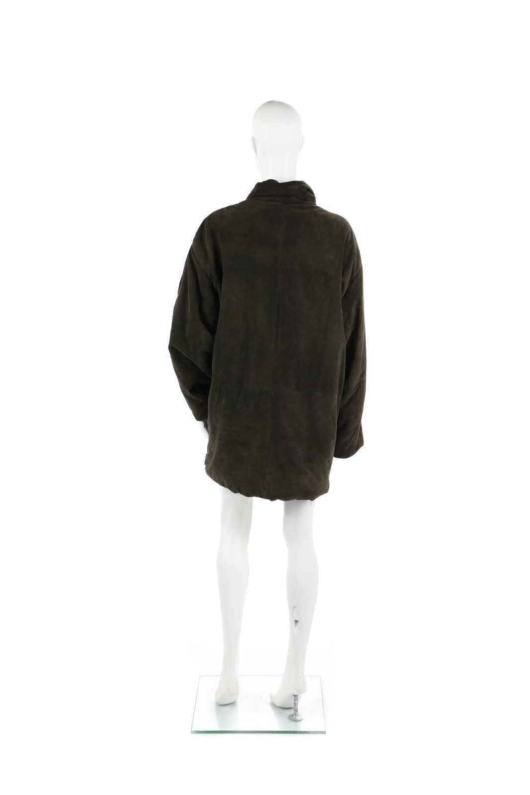 FERRE' GIANFRANCO Giaccone imbottito in velluto color verde. Camoscio. . Etichetta presente. Made in Italy.