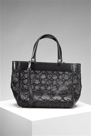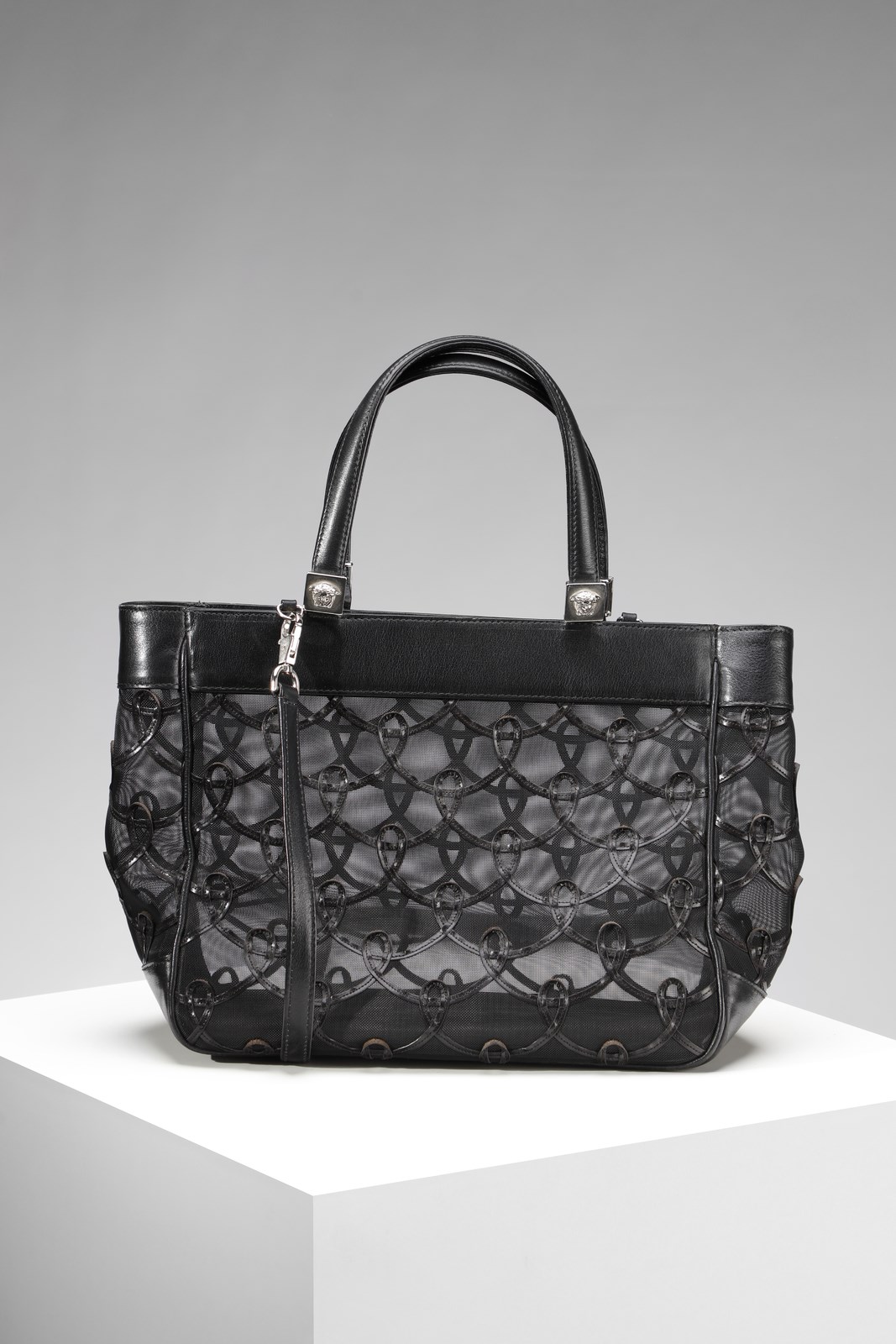 VERSACE GIANNI (1946 - 1997) - Borsa in pelle e tessuto tecno ricamato in pelle con borchie medusa e tracolla,.