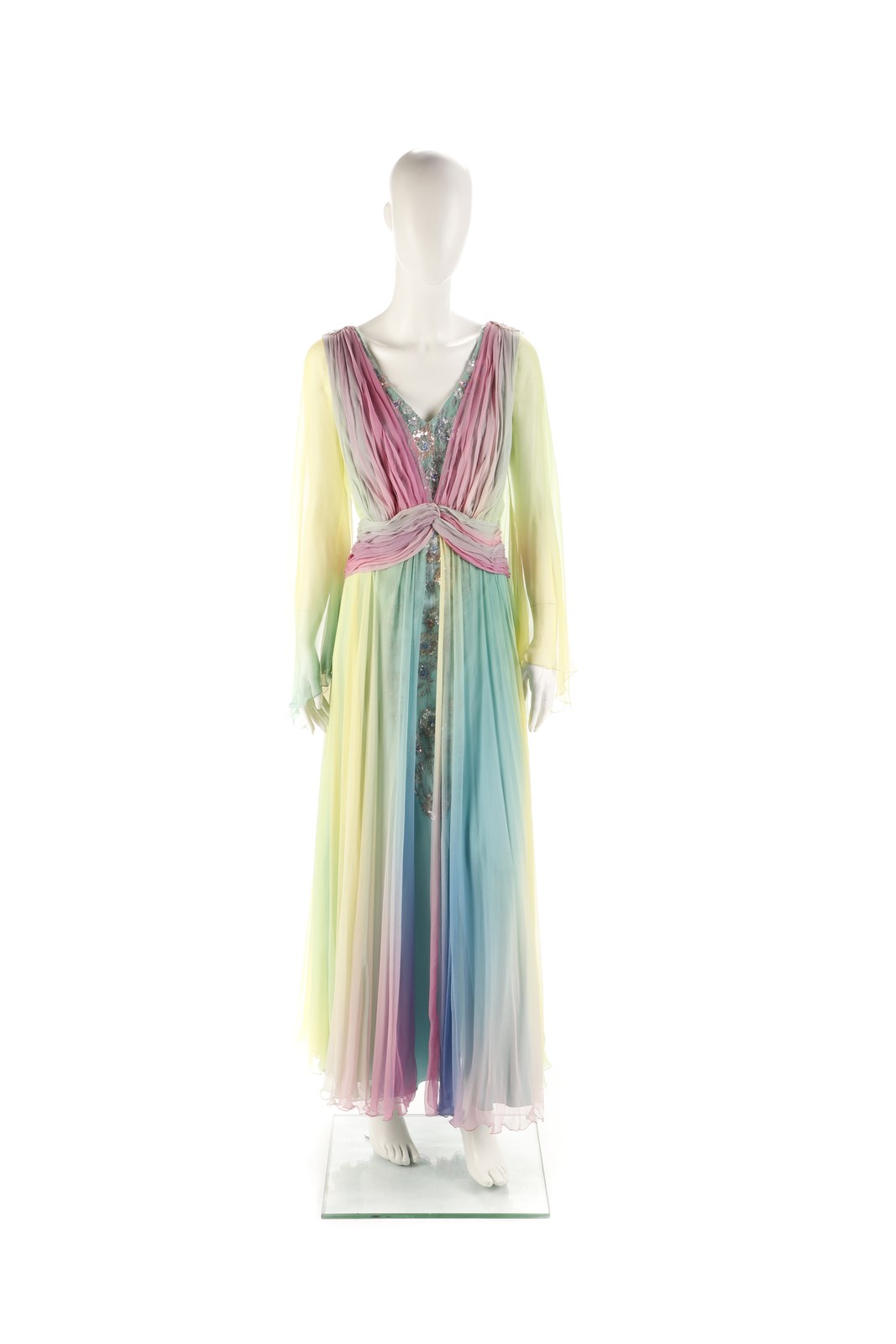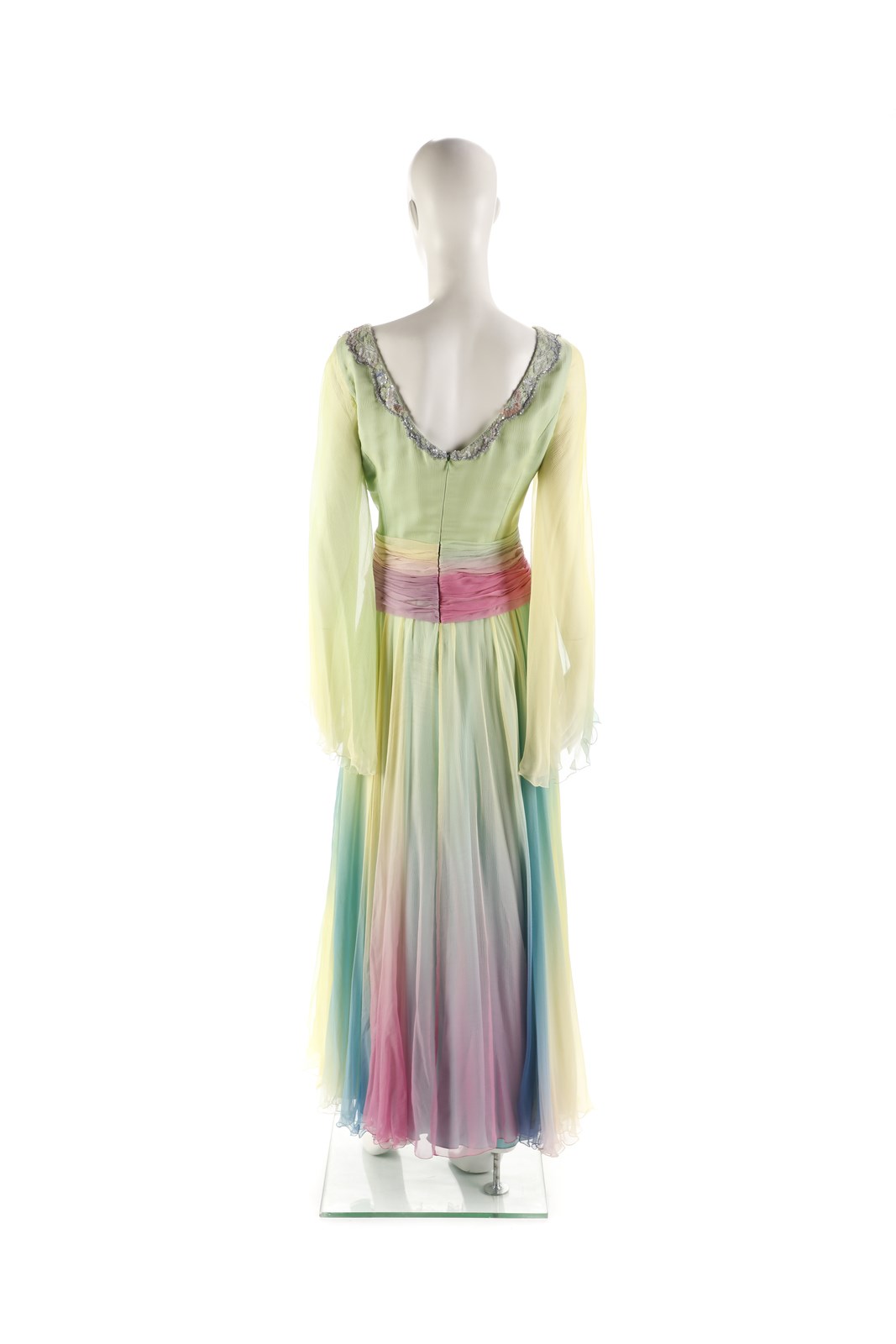 AUTORE NON IDENTIFICATO Abito lungo in seta, multicolore con manica lunga, scollo a v. Premiere Montenapoleone. Seta. . Provenienza: collezione privata, Monza.