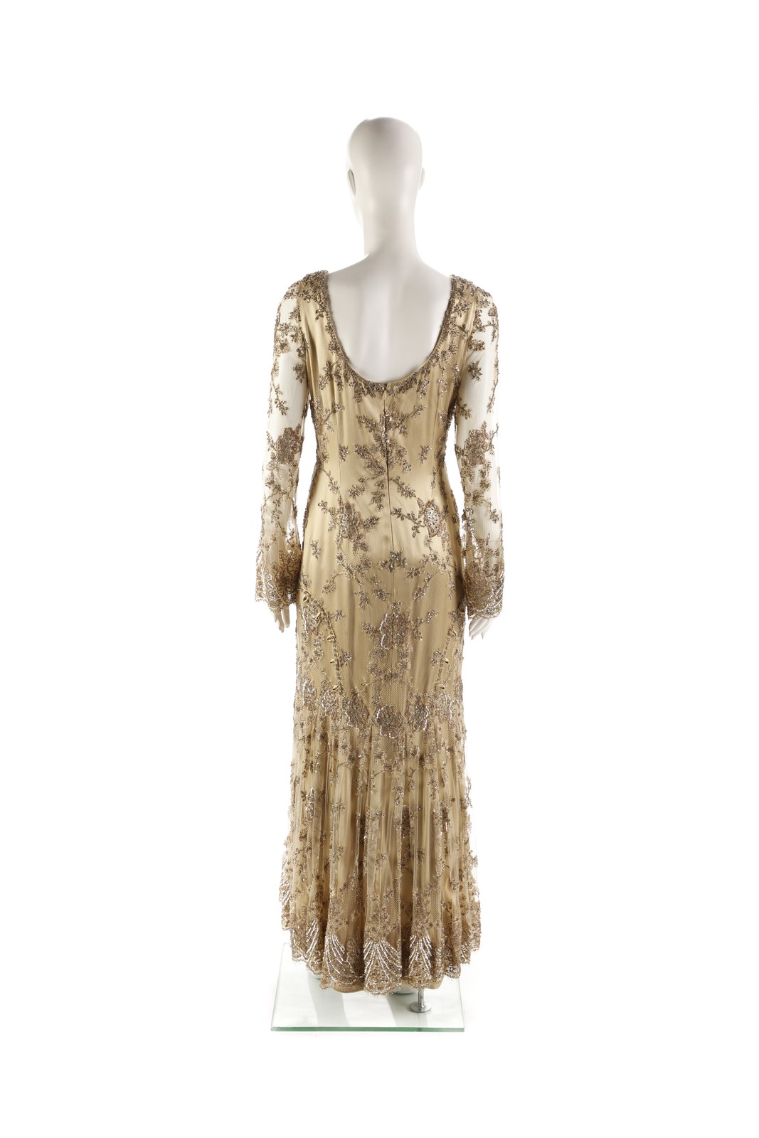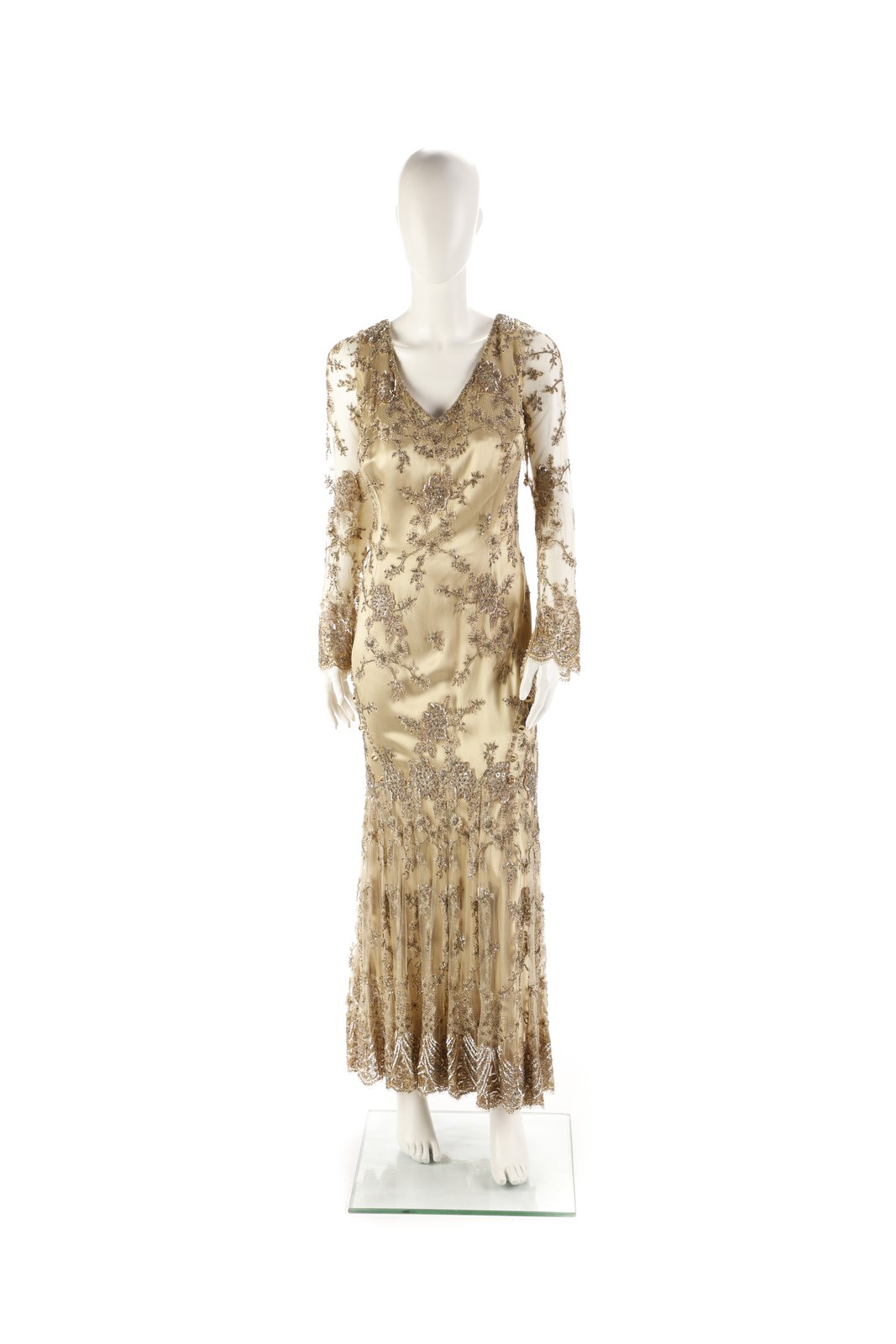 AUTORE NON IDENTIFICATO Abito alta sartoria, da sera lungo con maniche lunghe, nei toni dell' oro e del bronzo. Premiere Montenapoleone, made in Italy. Pizzo e seta. . Provenienza: collezione privata, Monza.