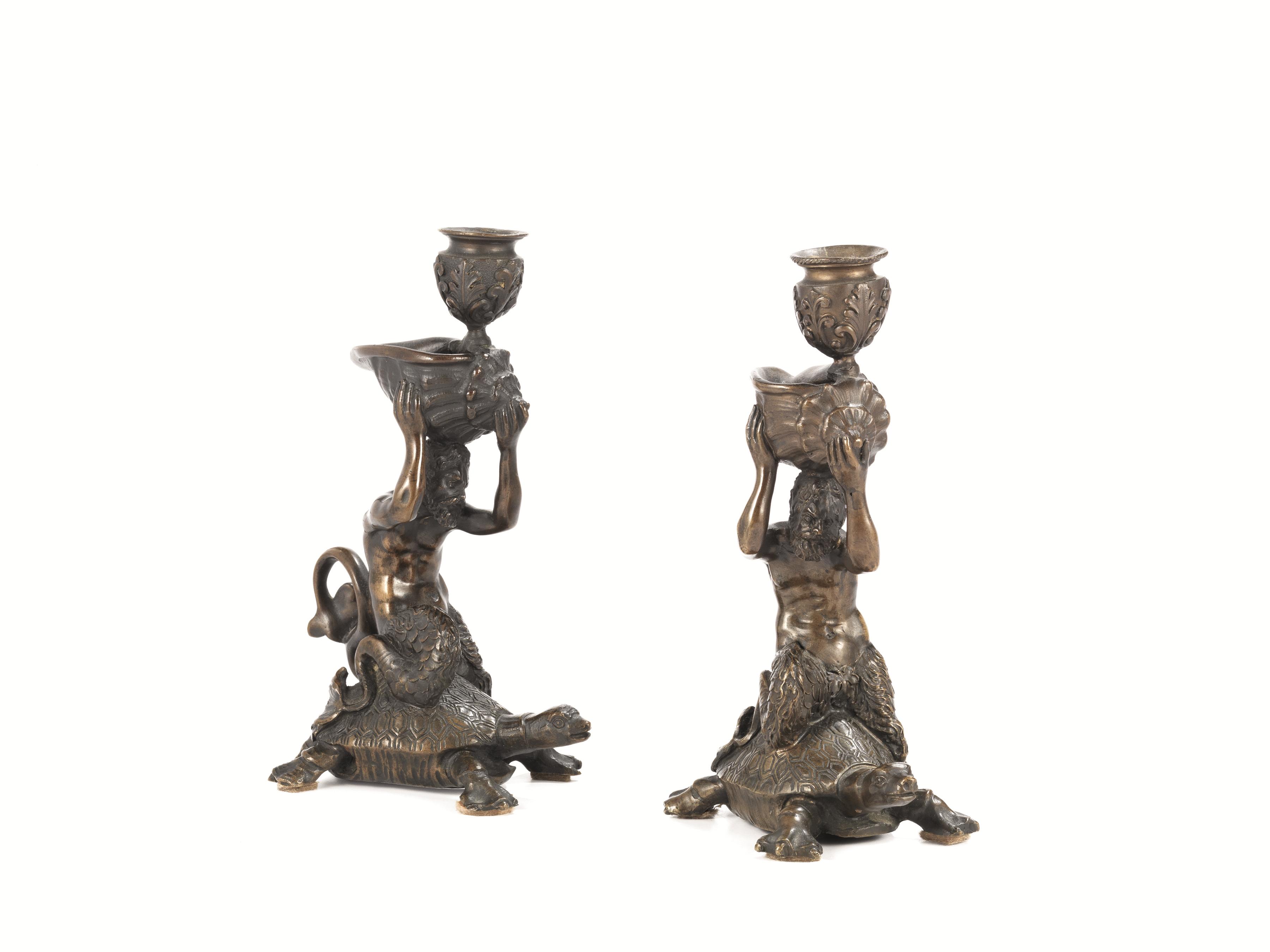 Coppia di candelieri, in bronzo raffiguranti satiro tritone su tartaruga e sostenente una conchiglia, alt. cm 19 (2)