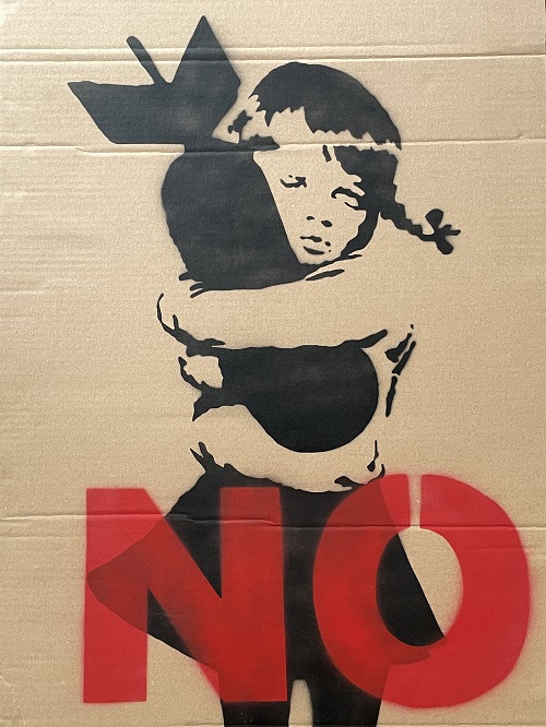 stencil spray su cartone utilizzato dai manifestanti in occasione della guerra in Iraq del 2003 a Londra, cm 82x53,5