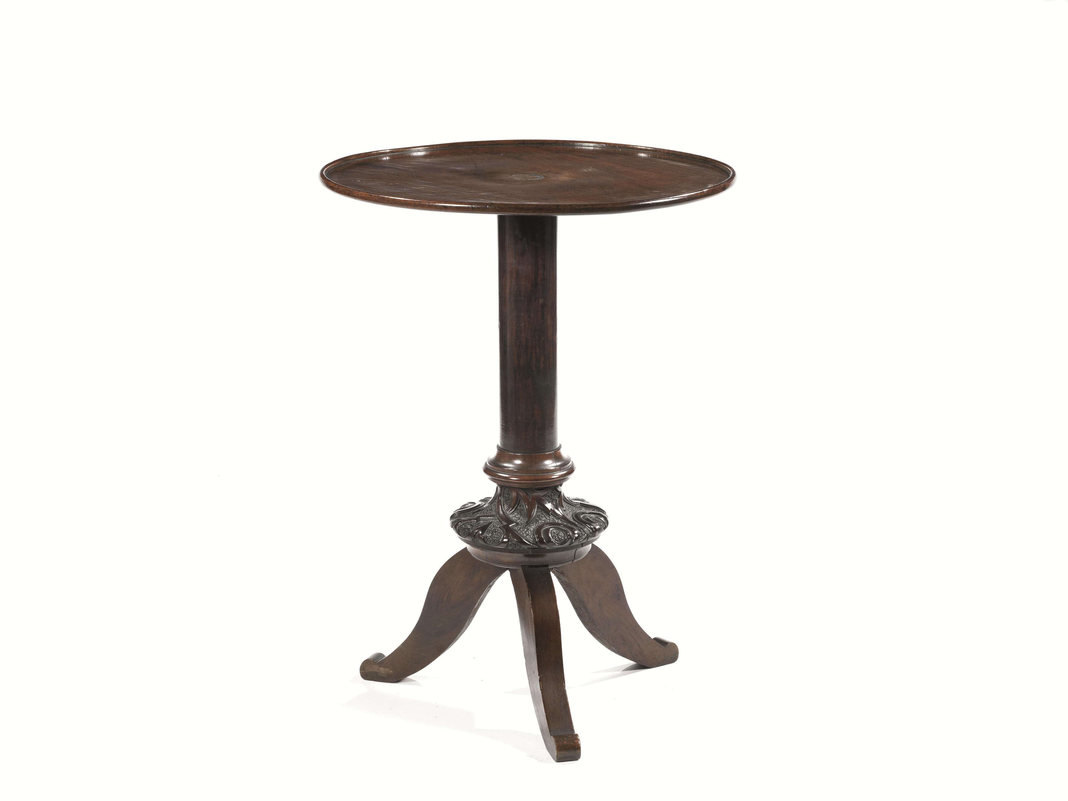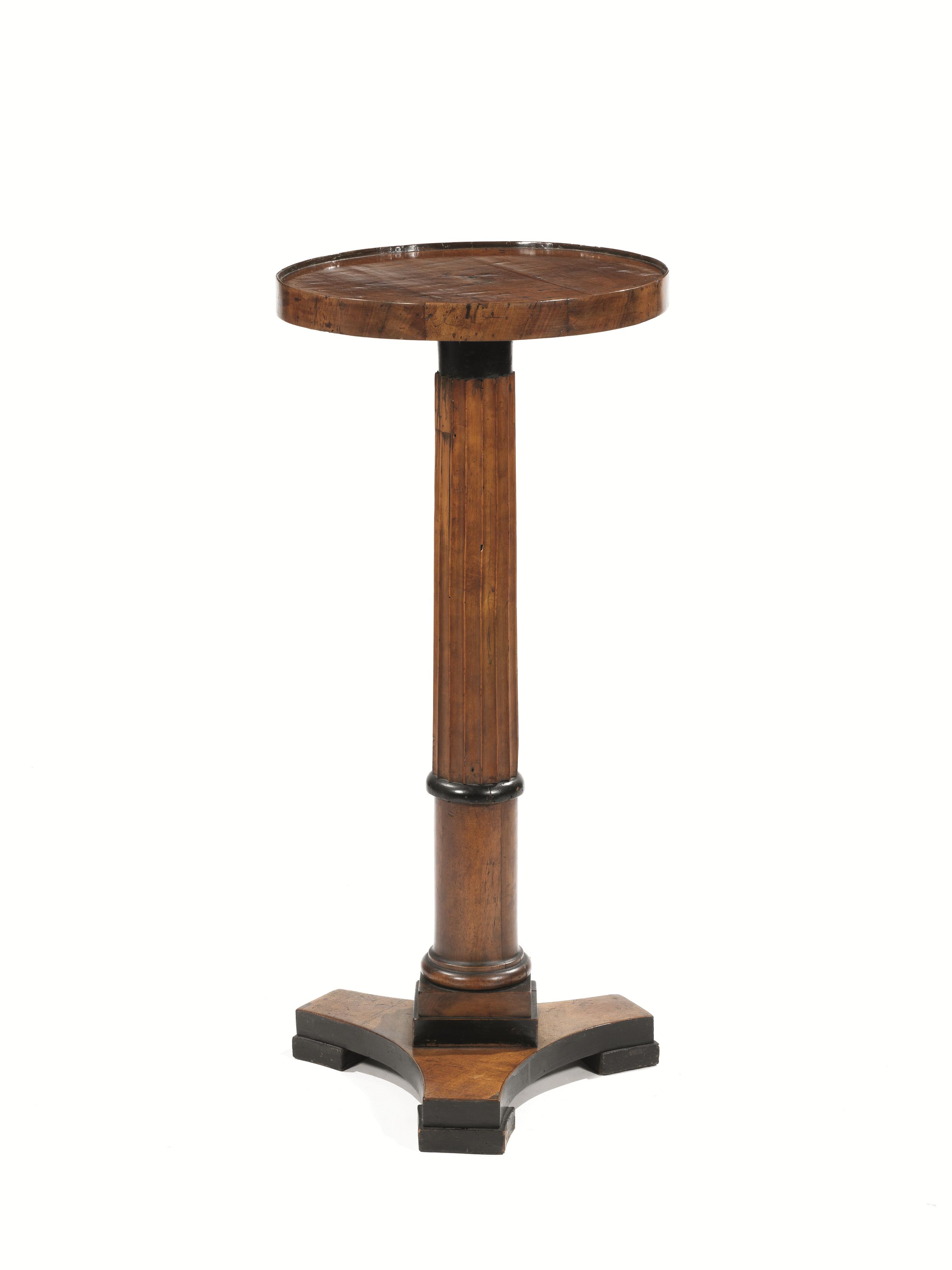 Due tavolini da appoggio, seconda metà sec. XIX, in noce, piano circolare, fusto a balaustro uno liscio e l'altro scannellato, base tripode, diam. cm 54, alt. 74 e diam. cm 36, alt. 78 e tavolino servomuto a gamba centrale scanalata, piano rotondo a vassoio, diam. cm 40 circa (3)