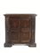 Credenza, in stile Seicento, in noce a patina chiara, piano rettangolare con becco di civetta, gocciolatoio sotto al piano, due sportelli sformellati con lesene intagliate ai lati, cm 105x42x110