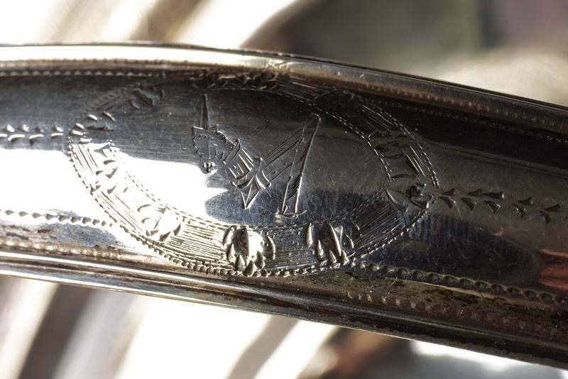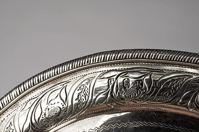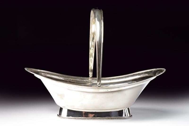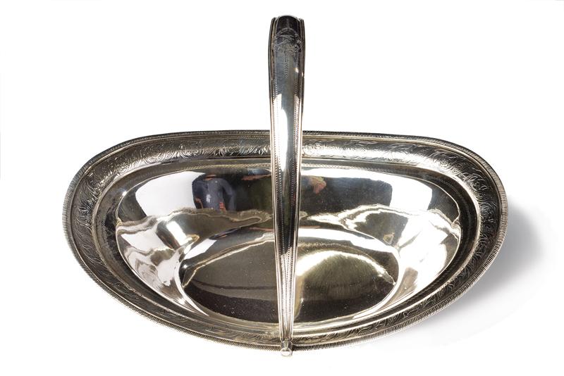 Cestino in argento di forma ovale. Dublino 1806, argentiere Robert Breading. Misure: h con manico cm 25 ca; h senza manico cm 11,2 ca; cm 32,5x24,5 ca; g 937 ca. Buone condizioni.