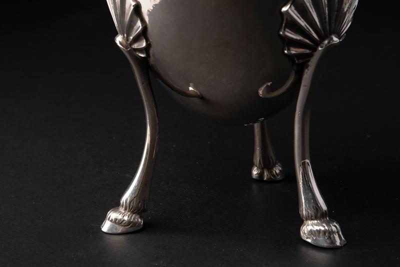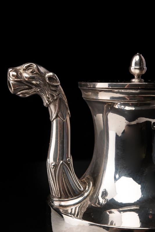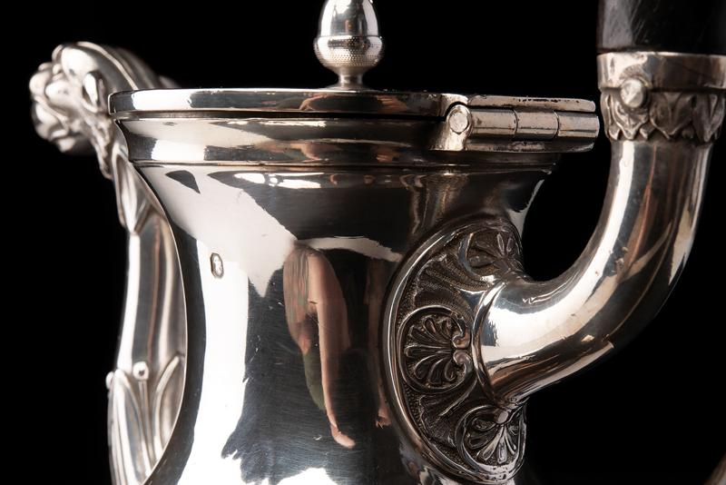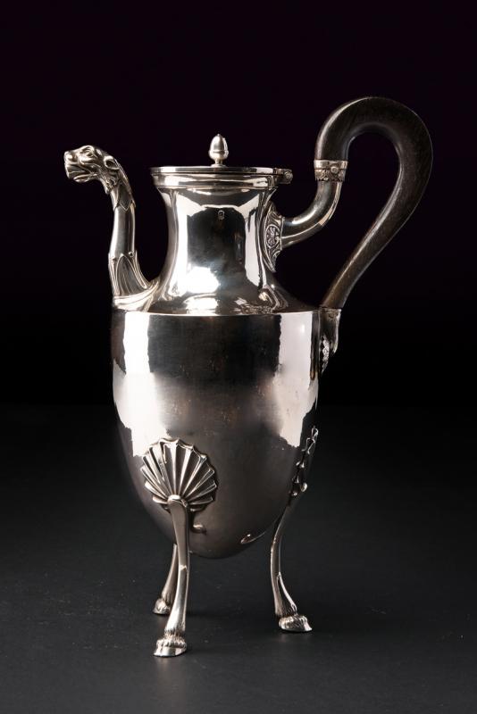 Caffettiera tripode in argento con manico ad ansa in legno. Parigi 1809-19, argentiere Jean-Baptiste-Claude Odiot (?). Misure: h max cm 26,5 ca; larghezza max cm 18 ca; g 780 ca. Buone condizioni.