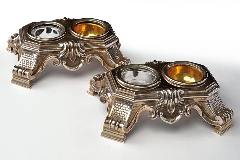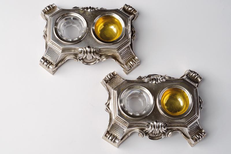 Coppia di saliere doppie in argento con vaschette estraibili in vetro e argento, in stile Luigi XVI di Palermo. Italia, fine del XIX secolo. Marchio '800'. Misure: h cm 4,5 ca; cm 14x11 ca; g netti 480 ca. Condizioni molto buone.