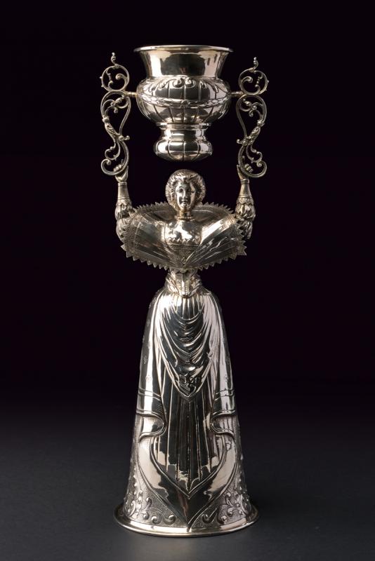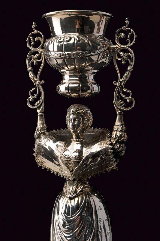 Grande coppa dell'amore in argento in figura femminile, decorata a motivi floreali. Germania, Hanau, argentiere B Neresheimer & Sohne, fine del XIX secolo. Misure: h cm 37 ca, g 751ca. Condizioni molto buone.