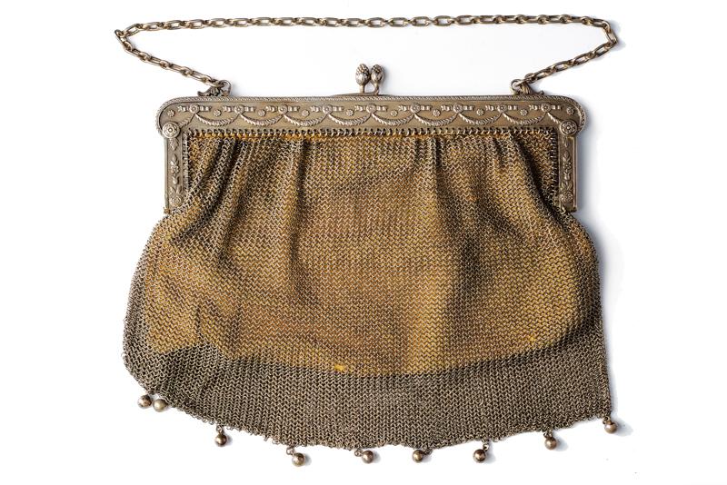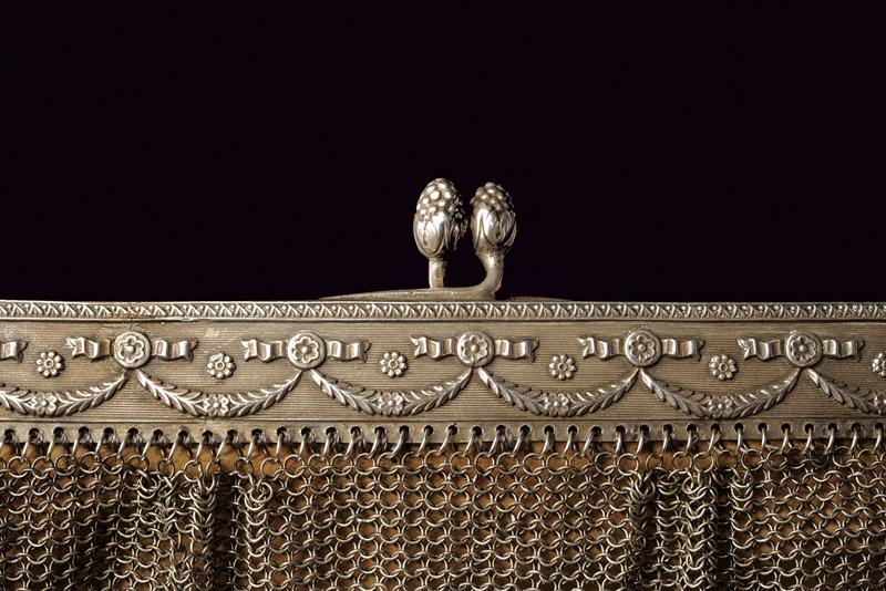 Borsa da sera in maglia d'argento. Marchio d'importazione austro-ungarico 1901-21. Misure: cm 18x20 ca ; peso lordo g 293. Difetti.