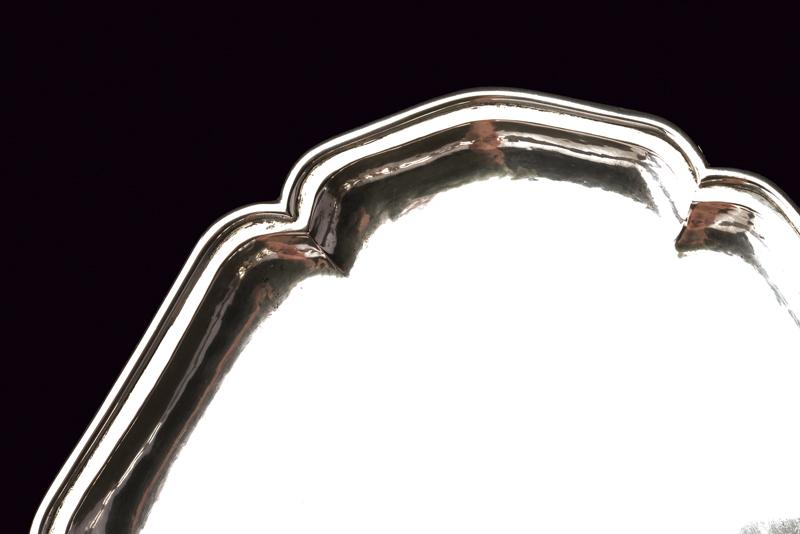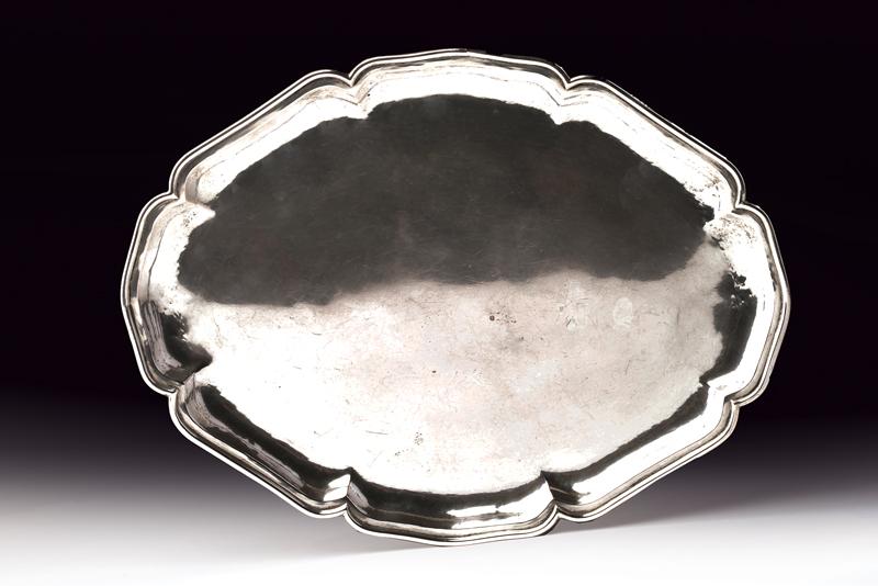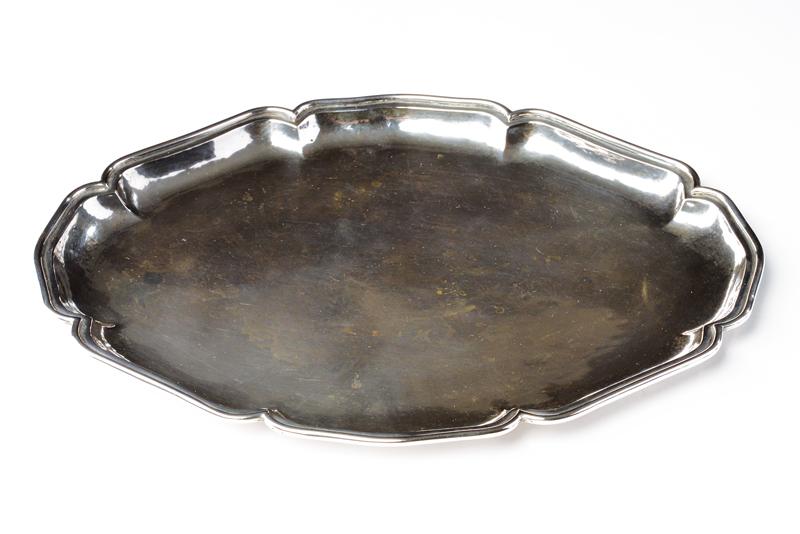 Vassoio in argento di forma ovale sagomata con bordura modanata. Italia, Padova, metà XX secolo. Misure: cm 31x23,2 ca; g 381 ca. Lievi difetti.