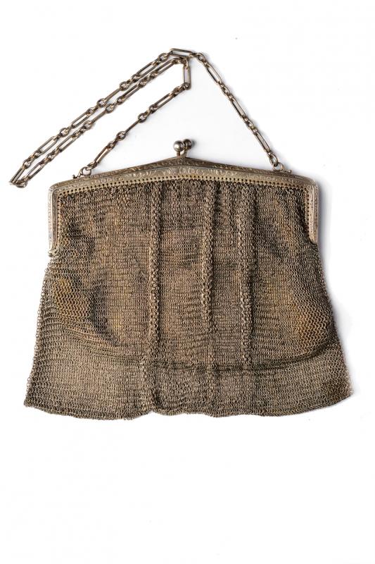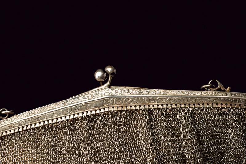 Borsa da sera in maglia d'argento. Marchio d'importazione austro-ungarico 1901-21. Misure: cm 15x15,5 ca ; peso lordo g 267. Buone condizioni.