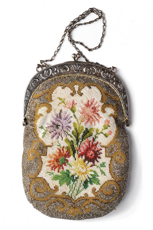 Borsa da sera in microperle e montatura in argento. Austria, prima metà XX secolo. Misure: cm 20,5x13 ca. Buone condizioni.