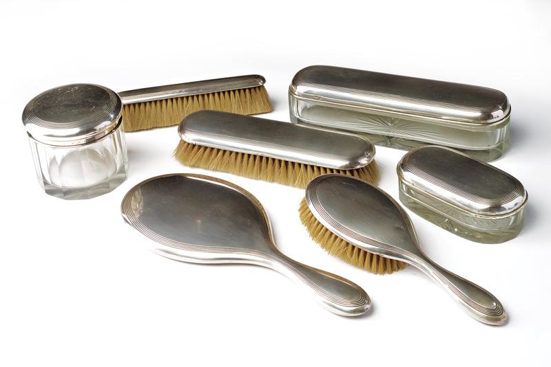 Servizio da toilette in argento e vetro composto da 7 pezzi. Italia, prima metà del XX secolo. Lievi difetti.