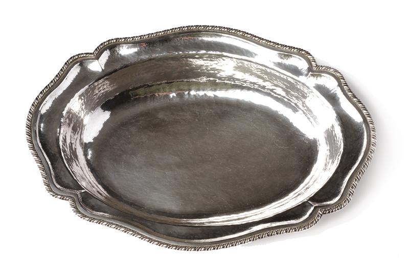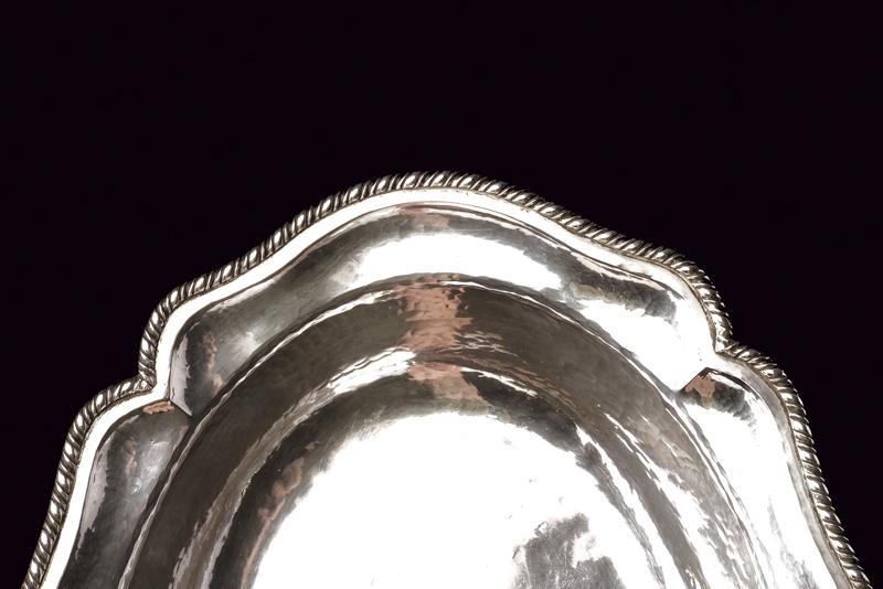Centrotavola in argento di forma ovale sagomato con bordura San Marco. Italia, Verona, marchio del 'fascio' , 1935-44. Misure: cm 34,5x26 ca; g 568 ca. Buone condizioni.