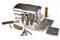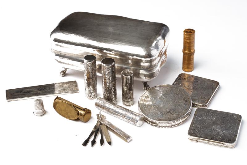 Lotto in argento composto da una scatola rettangolare sagomata, 3 porta cipria, un porta utensili per manicure, 5 astucci ed un ditale; uniti a 2 porta rossetto in metallo. Italia, XX secolo. Misure: max cm 16x9,5xh 7 ca; peso argento g 477 ca. Lievi difetti.