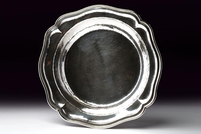 Centrotavola in argento di forma circolare sagomata con bordura modanata. Italia, Verona, marchio del 'fascio', 1935-44. Misure: diametro cm 29 ca; g 588 ca. Buone condizioni.