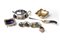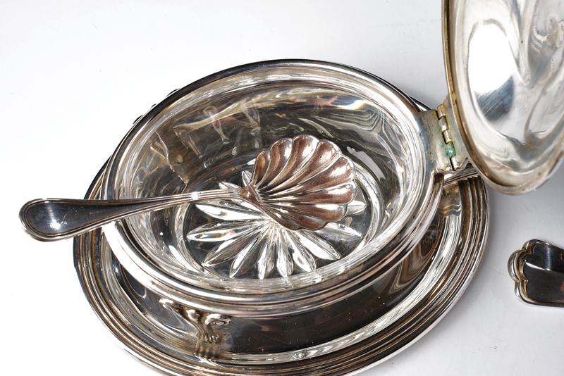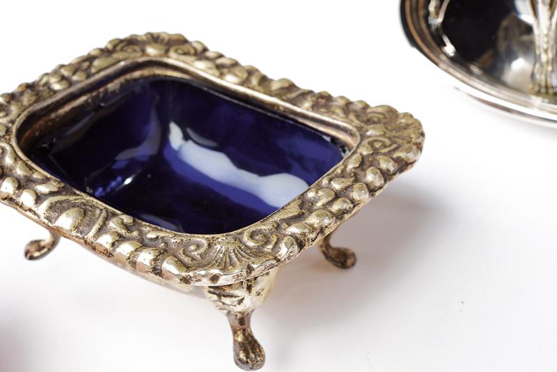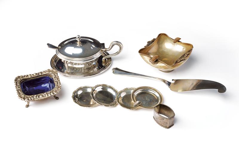 Lotto in argento composto da una formaggiera, un cucchiaino, una pala dolce, un posacenere, 6 piattini, un lega tovagliolo; unito ad una saliera in metallo argentato. Italia, XX secolo. Misure: lunghezza max cm 27,5 ca; peso argento g 604 ca. Totale n pezzi 12. Lievi difetti.
