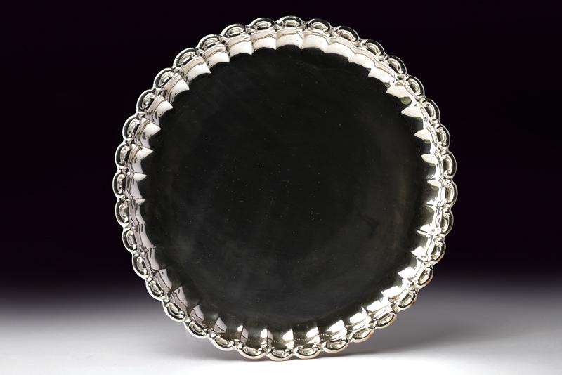 Vassoio in argento di forma circolare con tesa baccellata. Italia, 1935-44, marchio del 'fascio'. Misure: diametro cm 30; g 530 ca. Buone condizioni.