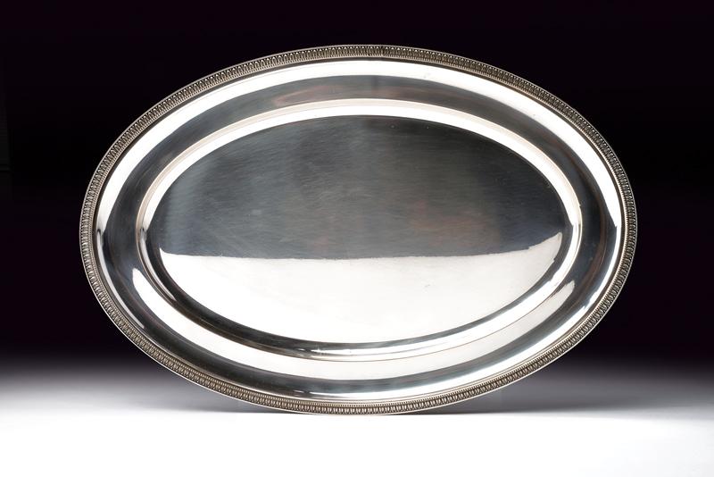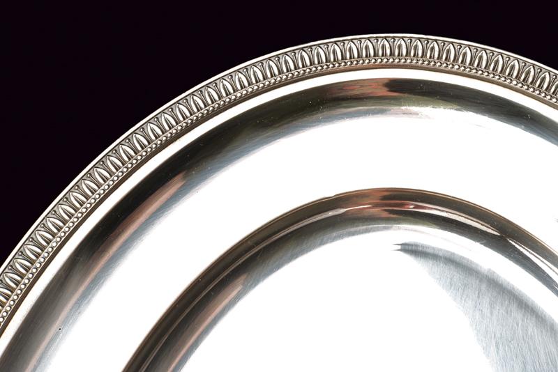 Vassoio in argento di forma ovale. Italia, Alessandria, argentiere Ricci Cesa, XX secolo. Misure: cm 45,5x30,5; g 847 ca. Lievi difetti.