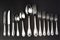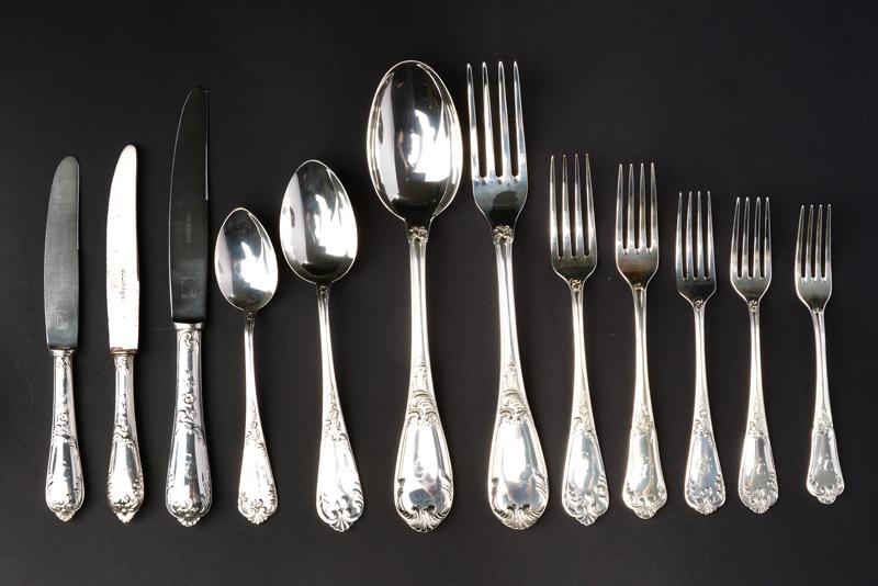 Servizio di posate in argento per 12 persone in stile Luigi XV, composto da 12 forchette, 12 cucchiai, 12 coltelli tavola; 12 forchette e 12 coltelli frutta; unito a 12 forchette tavola e a 12 forchette frutta di completamento, una coppia a servire e un tris frutta. Italia, XX secolo. Peso argento g 4050 ca. Segni d'uso.