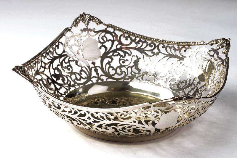 Cestino porta dolci in argento traforato. Italia, metà XX secolo. Misure: h cm 8; cm 22,5x22,5; g 430 ca. Buone condizioni.