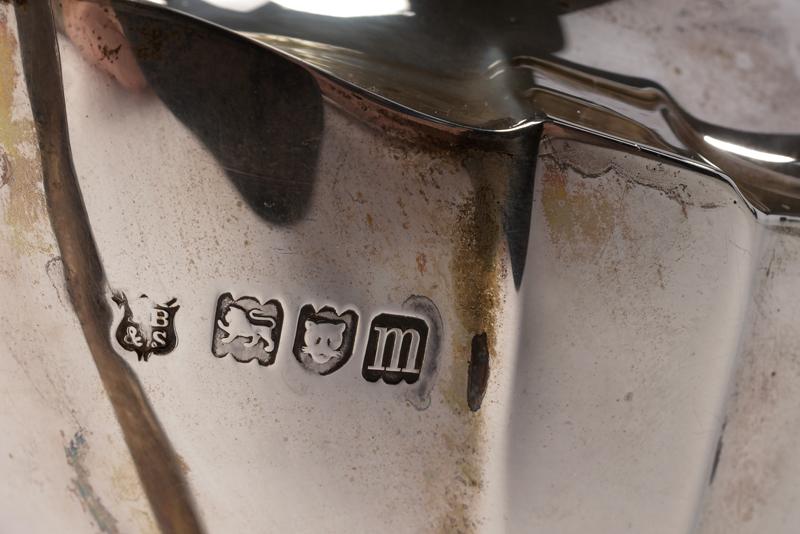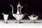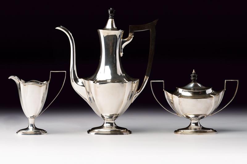 Servizio da caffè in argento sterling composto da caffettiera, zuccheriera e lattiera, con prese in legno. Regno Unito, inizi XX secolo. Misure: h max cm 26 ca; g 817 ca. Difetti.