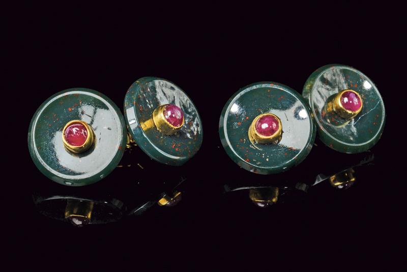 Paio di polsini da camicia in diaspro sanguigno montati in oro giallo 750/000 centrati da rubino. Peso 5,5 gr.