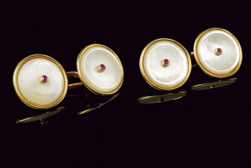 Lotto 69 | Polsini da camicia in oro giallo con madreperla e rubini