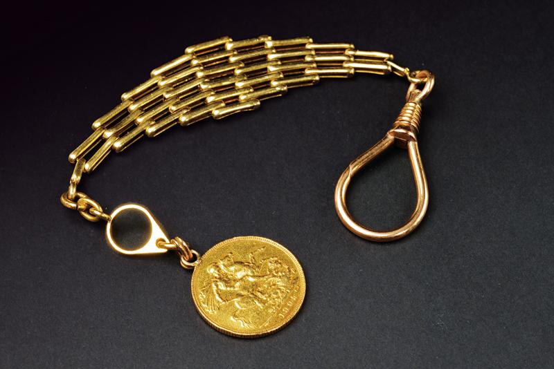 Portachiavi lavorazione a maglia realizzato in oro giallo 18 kt con moneta d’oro Sovrana in 22 kt con il ritratto di Re Edoardo VII coniata nel 1905, Sul rovescio San Giorgio che uccide il Drago. Con il marchio di zecca australiana 'P' (Perth Mint). Peso 23,6 gr